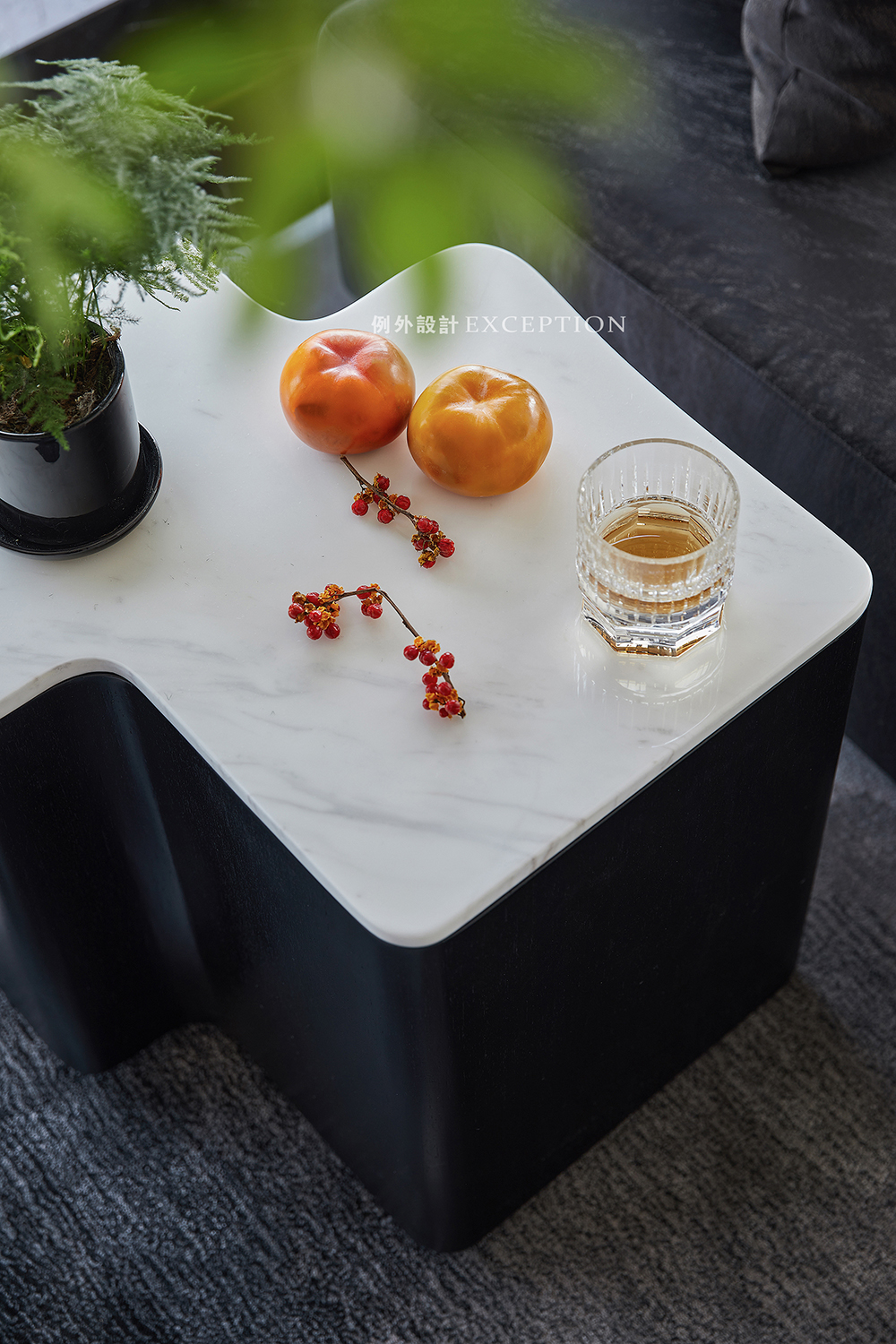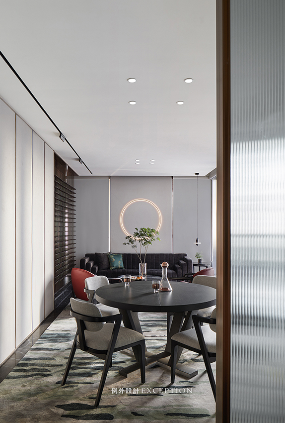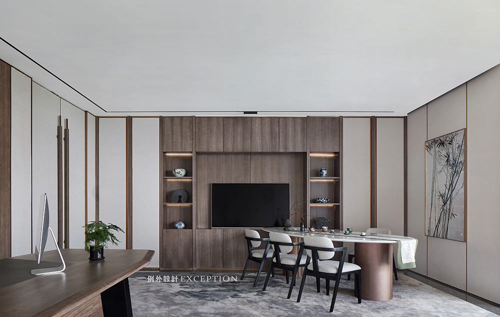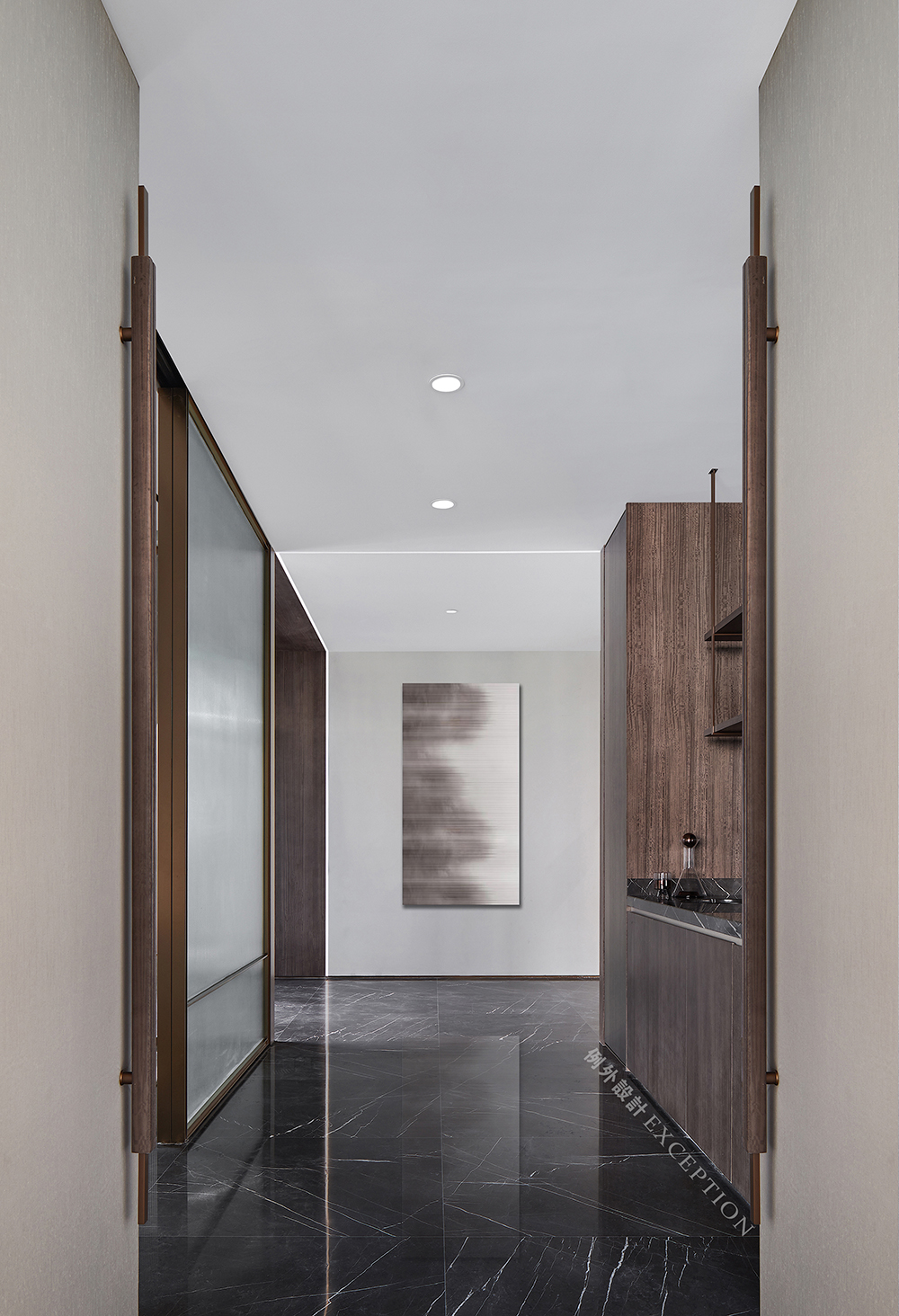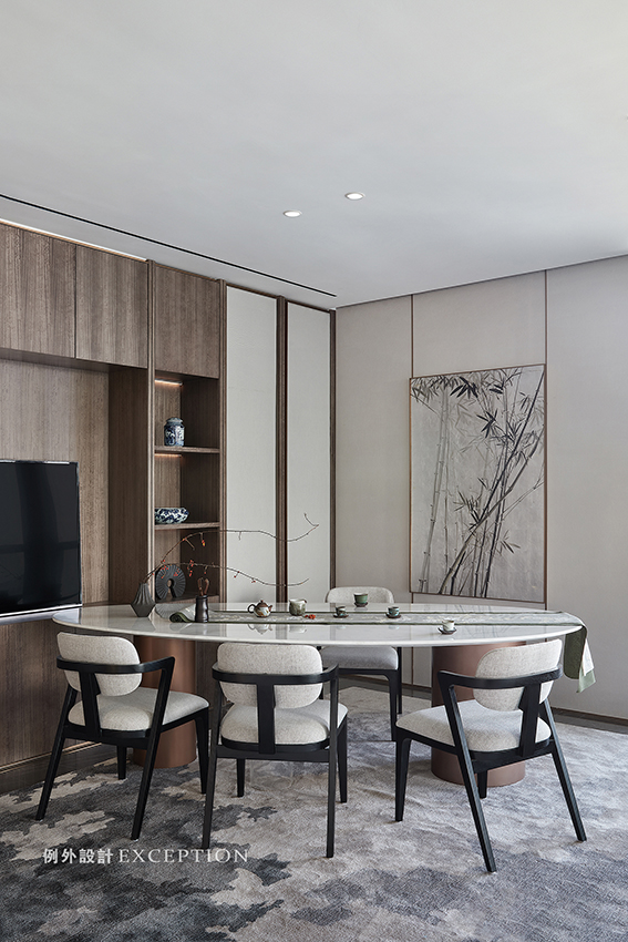 由前廳而入,空間以縹緲寫意的抽象掛畫開啟序章,清朗簡約的線條勾勒出端然有序的逸致。深沉穩重的木飾面柜體集展示與收納于一體,同時,大理石與黃銅組合的多功能茶桌豐富空間的場景層次,營造區別于浮華淺表的東方純粹美學。