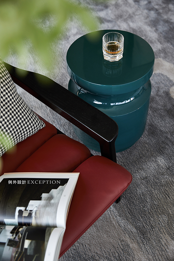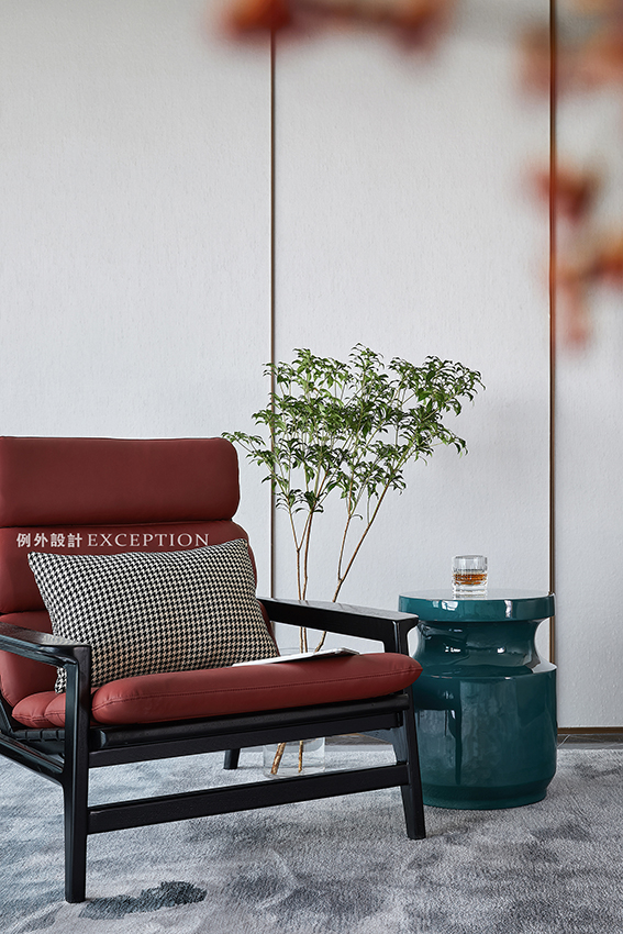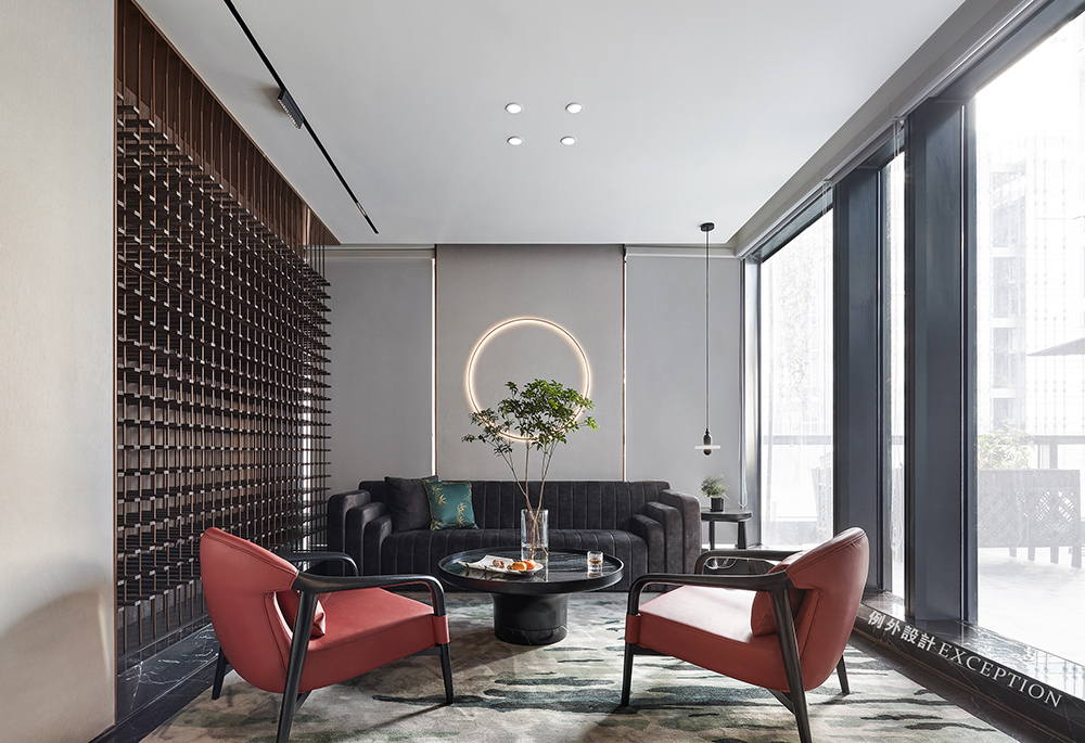 空間一角,幾枝青翠融入自然的生機,緋紅與典雅綠構成一幅和諧靜謐的畫面。肌理豐盈的山水紋幾面光影可鑒,賓客間談笑風生,來杯威士忌微醺空間的輕奢節奏,設計于細微之處關照商務精英的社交需求,獨特清靜的空間氣度也宛若天成。