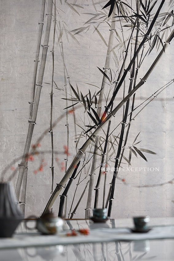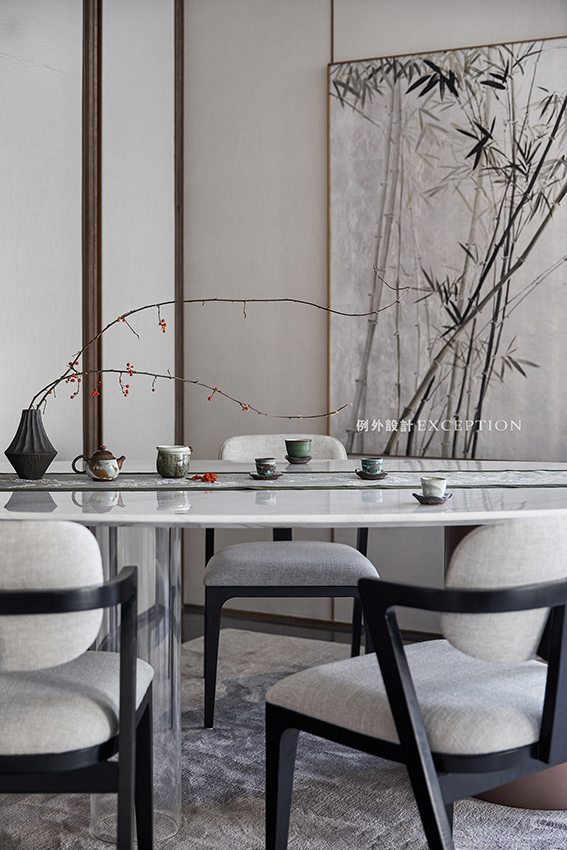 進入空間,流淌的雅致和詩意縈繞心頭難以忘懷。一陣風起,亭亭修竹婆娑而舞,茗煙裊裊升起,頗有魏晉文士竹林雅集的風骨詩性。在木色與米白的淡然中,青瓷小物點染出空間的悠然與達觀,彰顯了曠遠開闊的人生格局。