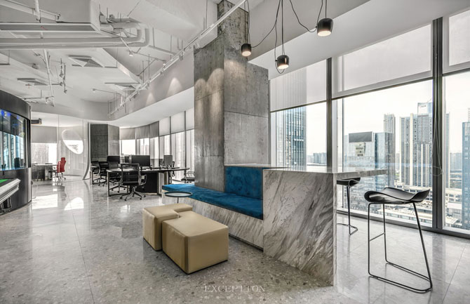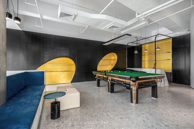 休閑區(qū)采用開放式布局,加入卡座、橢圓物架,擺上雜志書籍,抑或是咖啡佳釀,營(yíng)造一種咖啡吧式的生活格調(diào),讓工作和生活無聲契合。金色異型屏風(fēng)搭配同色桌球臺(tái),流露道不盡的活力與品位。