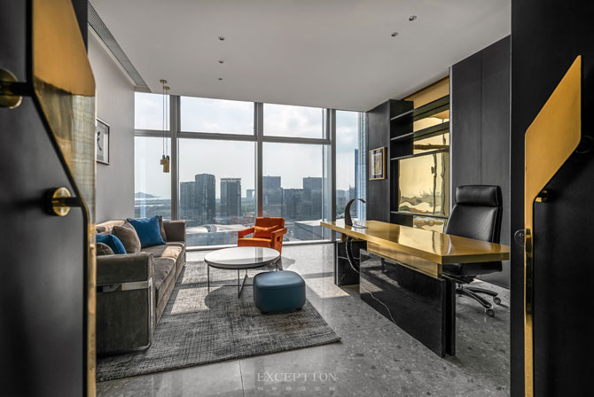 簡(jiǎn)潔、大量留白的天花墻壁,讓厚德載物的字幅更加大放光彩。辦公桌背后書柜以土黃色為主,寓意財(cái)運(yùn)與美好。書柜側(cè)邊白色燈帶化解了黑色木飾面的壓迫感,只為將貼心周到引入空間。亞克力辦公桌腿簡(jiǎn)潔有力,營(yíng)造出通透開闊的辦公氛圍。