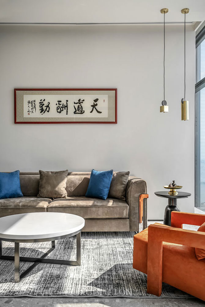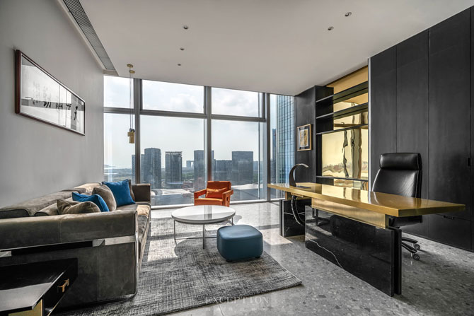 選取藍(lán)色色塊作為空間撞色,藍(lán)與金的組合,向來都是氣質(zhì)與品位相互融合的產(chǎn)物。取180°窗景作為掛畫,來取代其他的裝飾,天然純凈,渾然天成。
