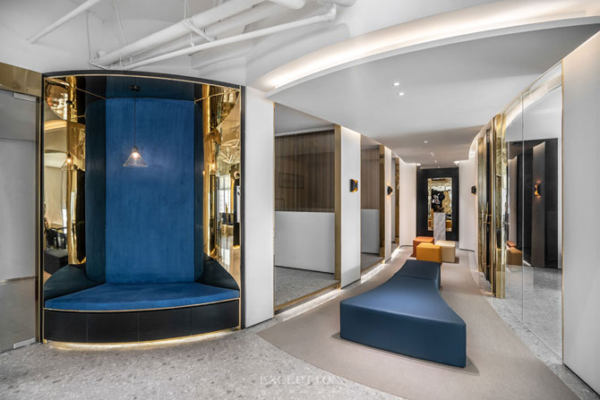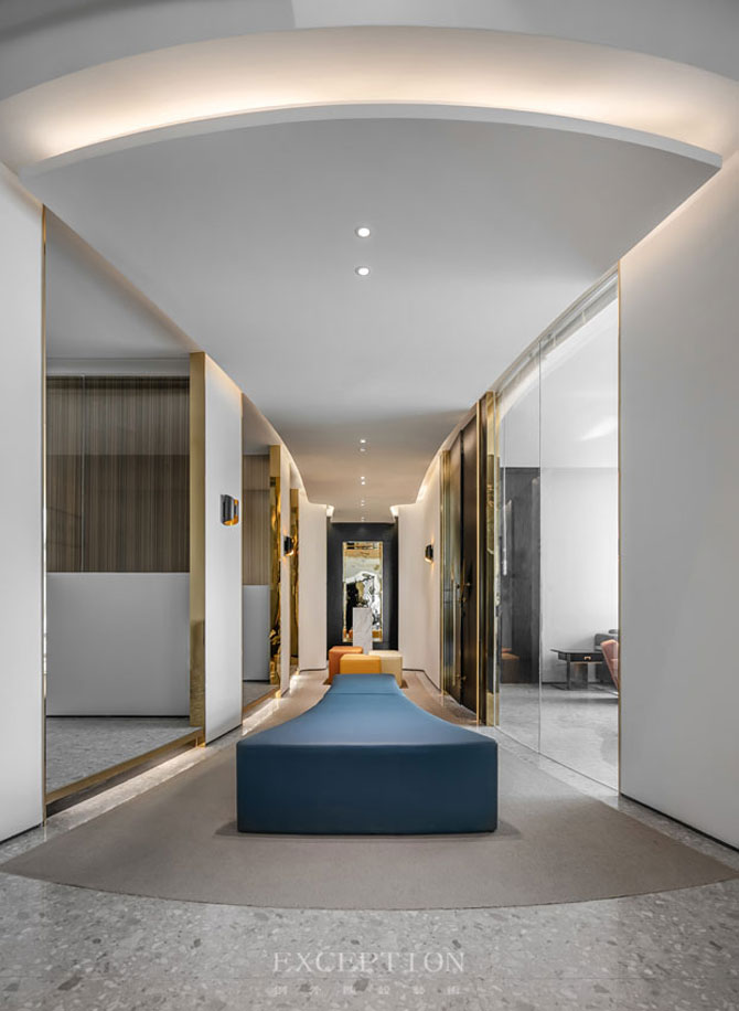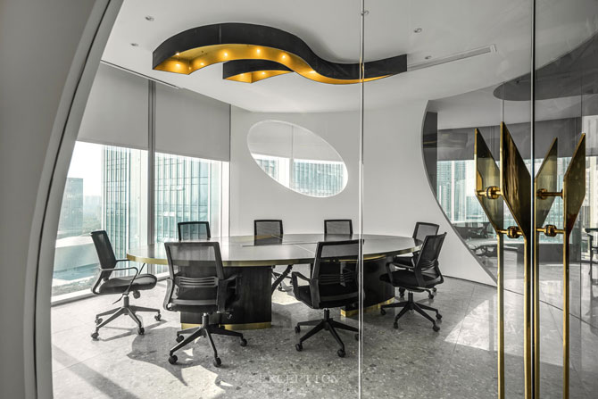不規(guī)則圓形讓人想起東方文化里的圓融暢順,和諧圓滿。天花燈光靈感源自公司logo造型,豐富并深化了公司文化的內(nèi)涵。