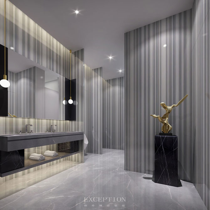 大面積的條紋石材讓人想起手風琴的節奏,無形中彰顯出空間的層次感。金色飾品與吊燈的點綴,將一絲低調的活力瞬間傳遞。
