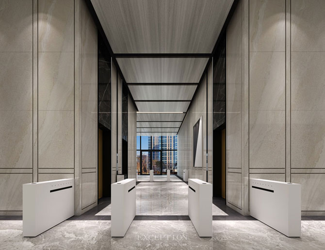 電梯廳的設計圍繞著檔次來展開,所以目極所處都是石材的身影,縱橫相間的線性排布營造出嚴謹有序的空間氛圍。