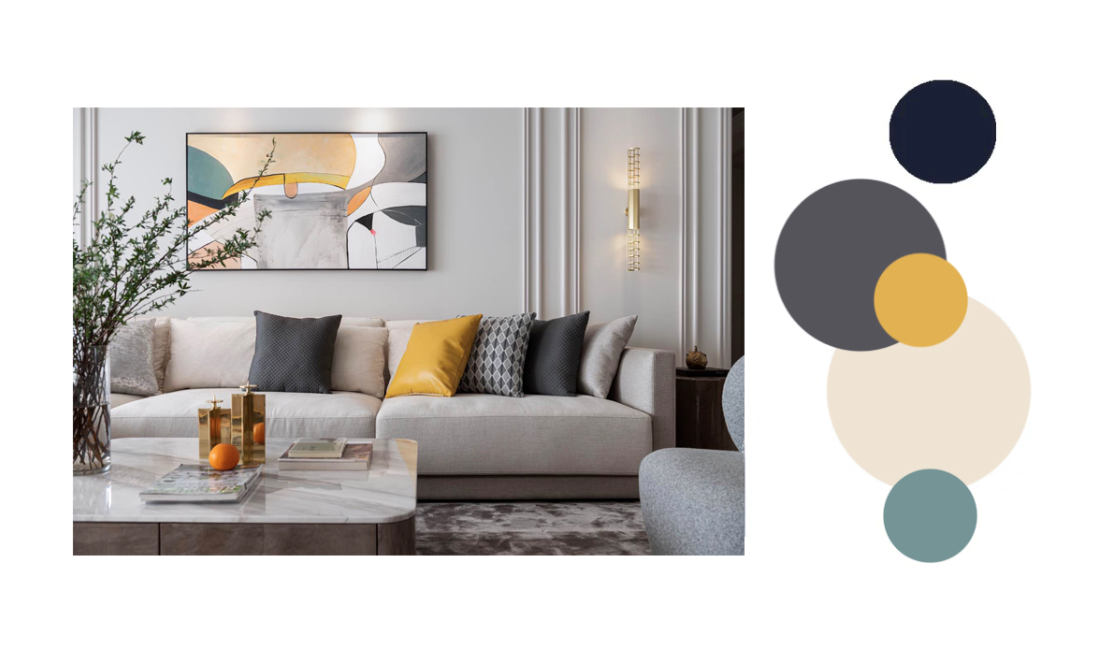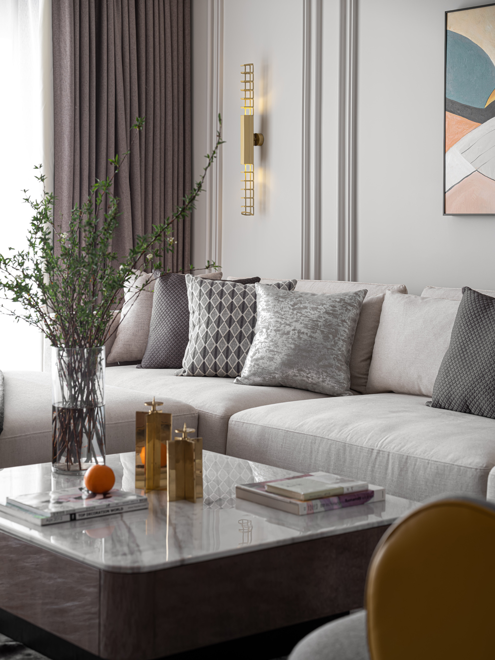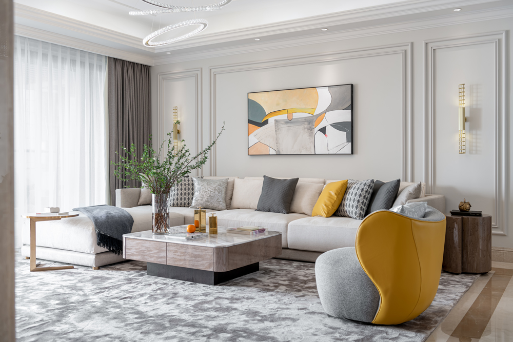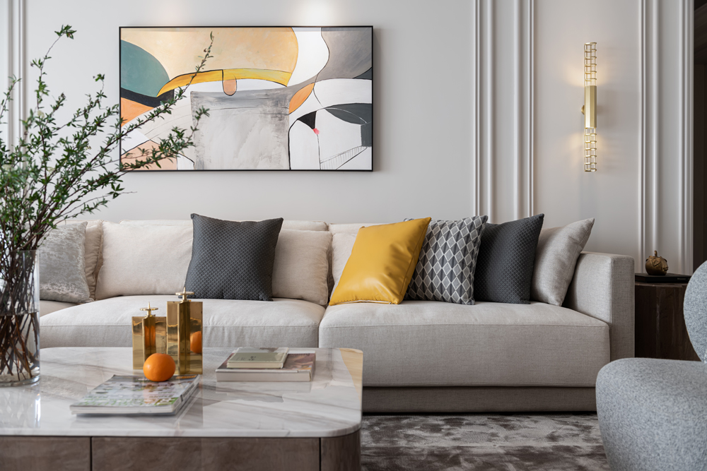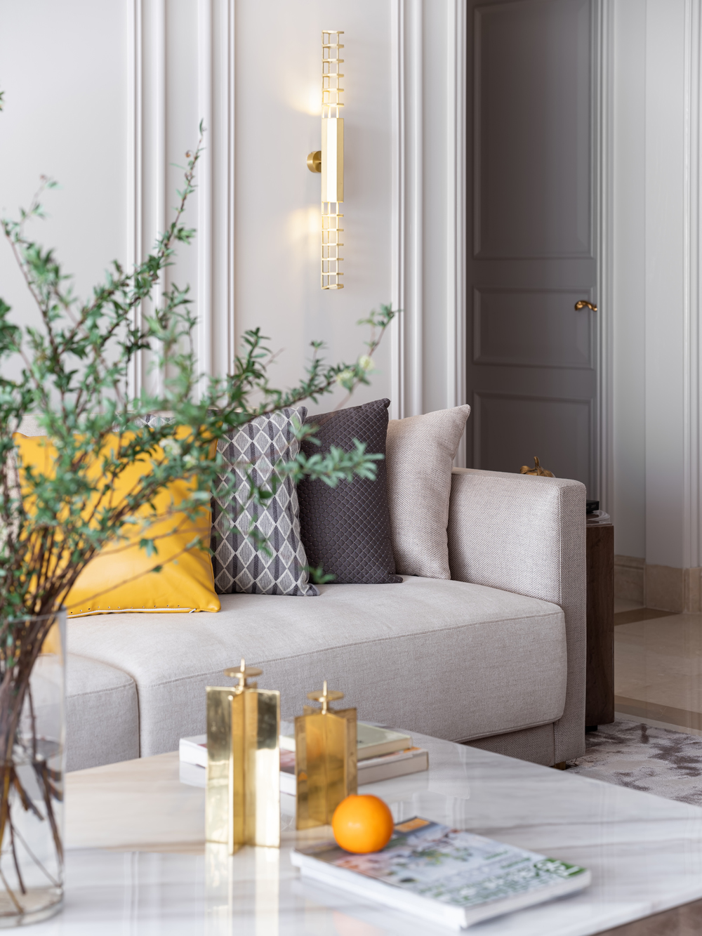 整體空間以暖調黑白灰為主,在軟飾上選取芒草黃跳色,清新明快,金色賦予空間優雅輕奢的質感。
