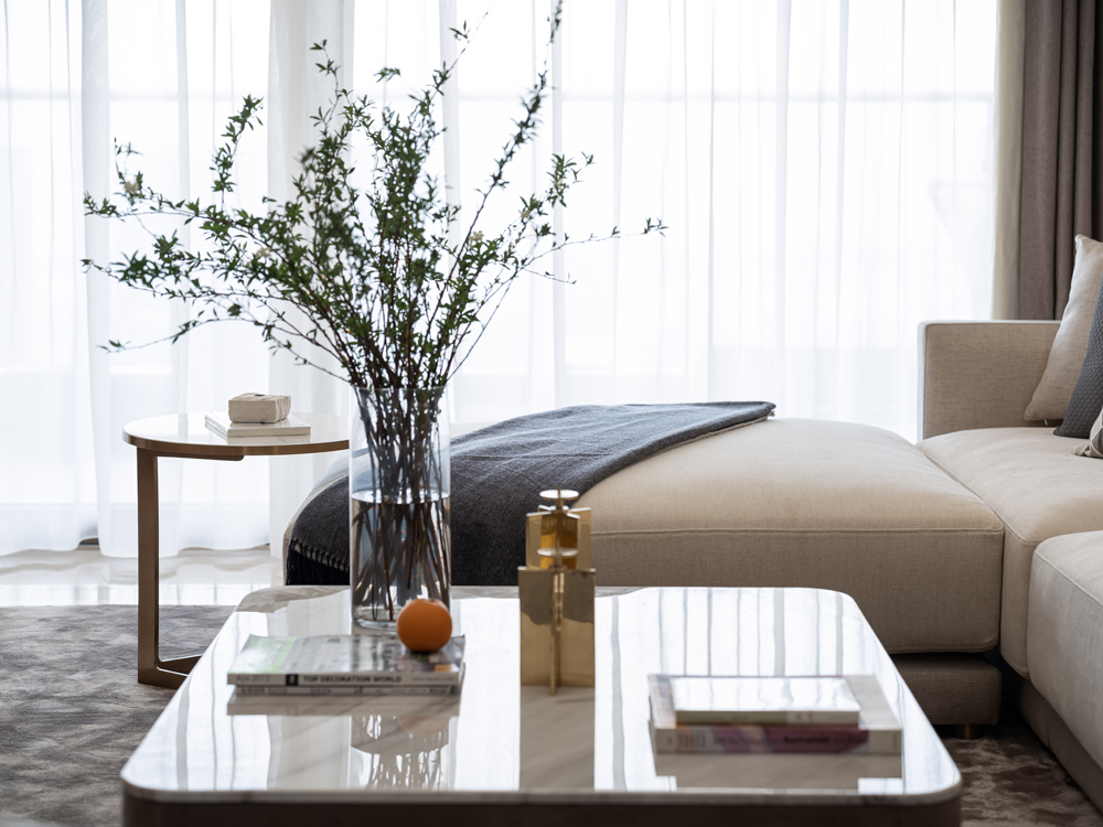理石材質茶幾源于設計師的悉心臻選,精致簡雅而不清冷。鏤空狀金屬壁燈與幾上金色擺件默契無聲,于細微處流露空間的雅奢韻味。三兩枝花葉清芬搖曳,彌漫一室淡淡的余韻與清寧。
