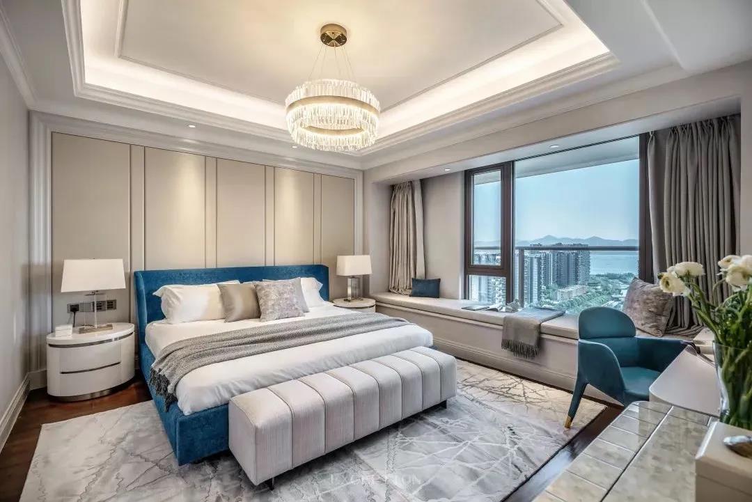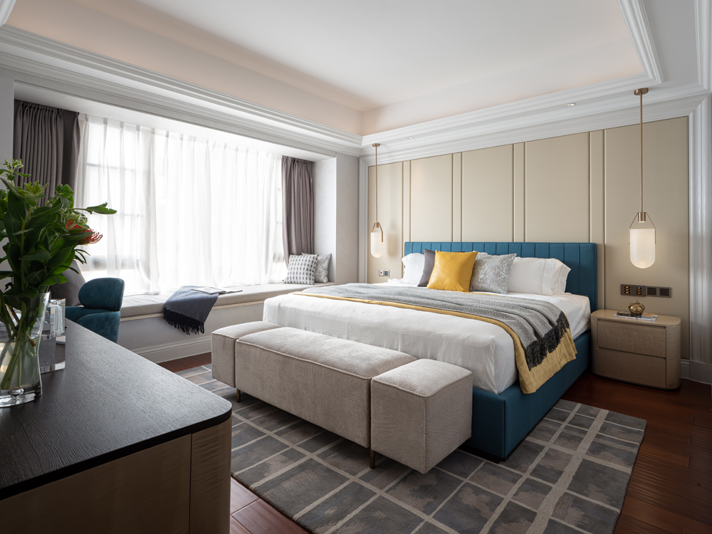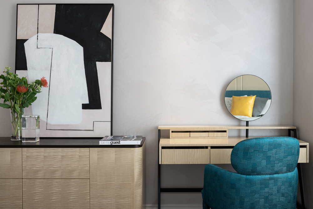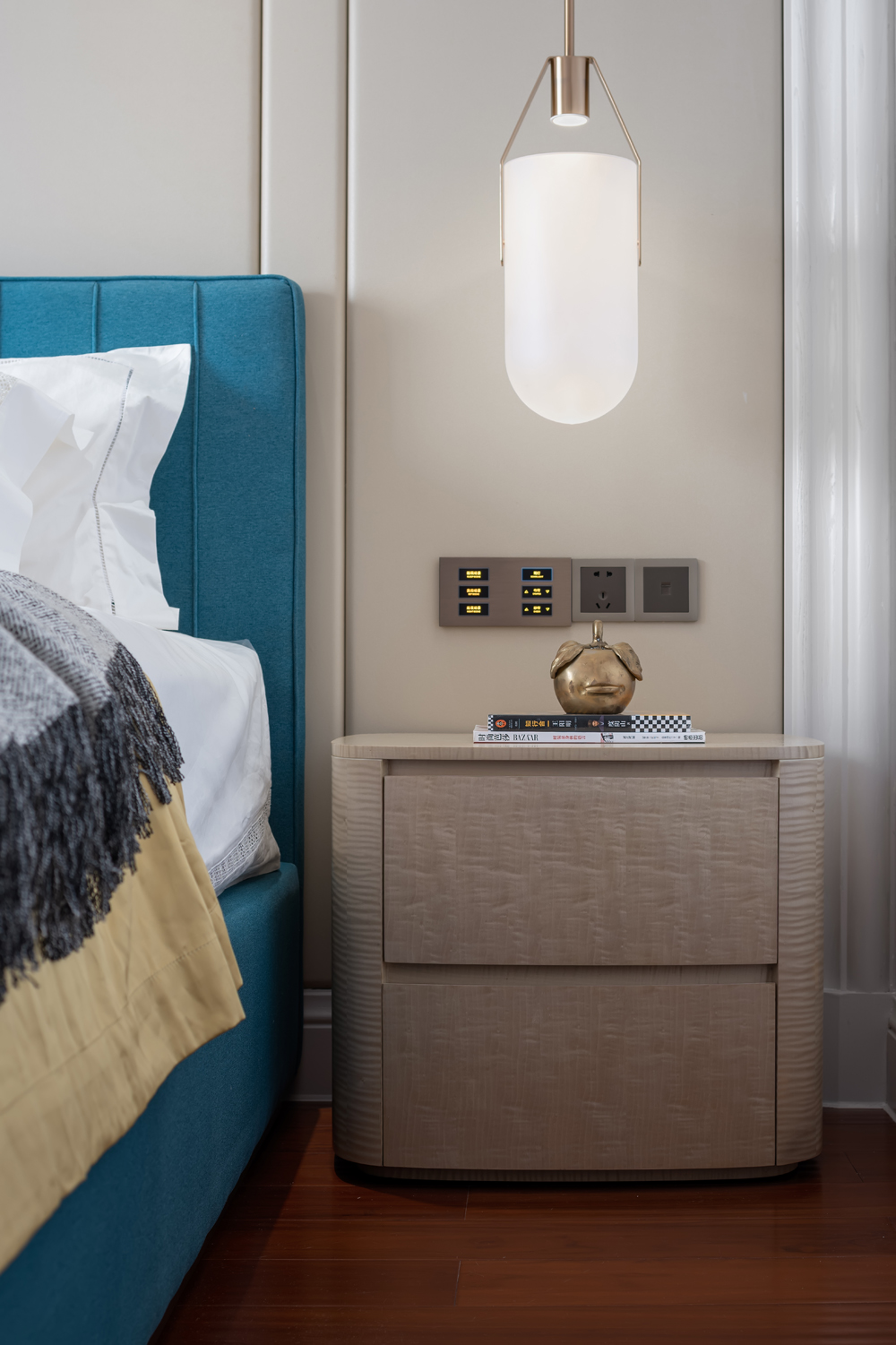 主臥精心搭配的物件創造空間的細膩情境,于細節里盛放余韻悠長的藝術感。鴻藝源設計認為家宅的美必須是私人訂制化的呈現,從純粹高雅的空間布局再到材質的甄選中,主人的居住品位如清風明月一般,絲絲入扣。