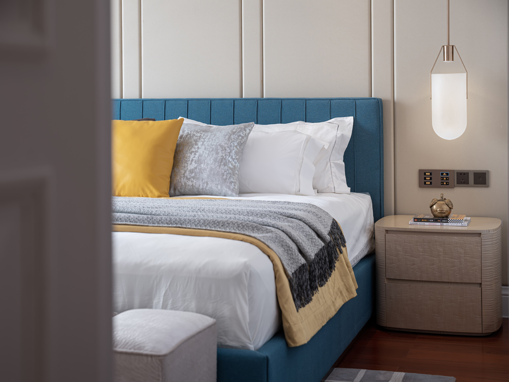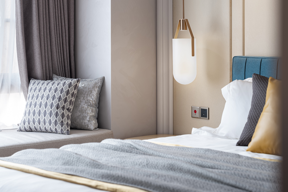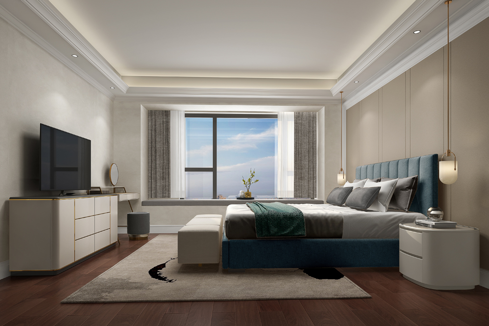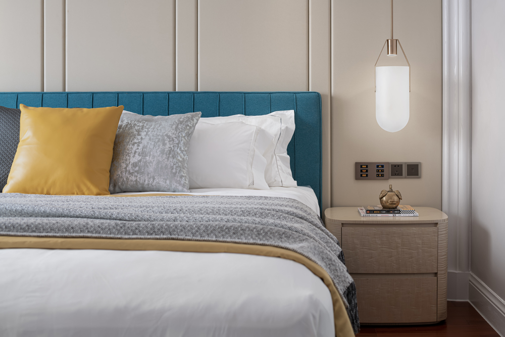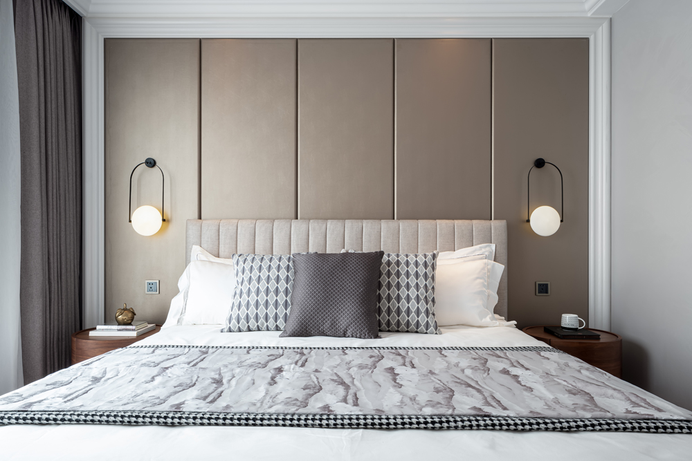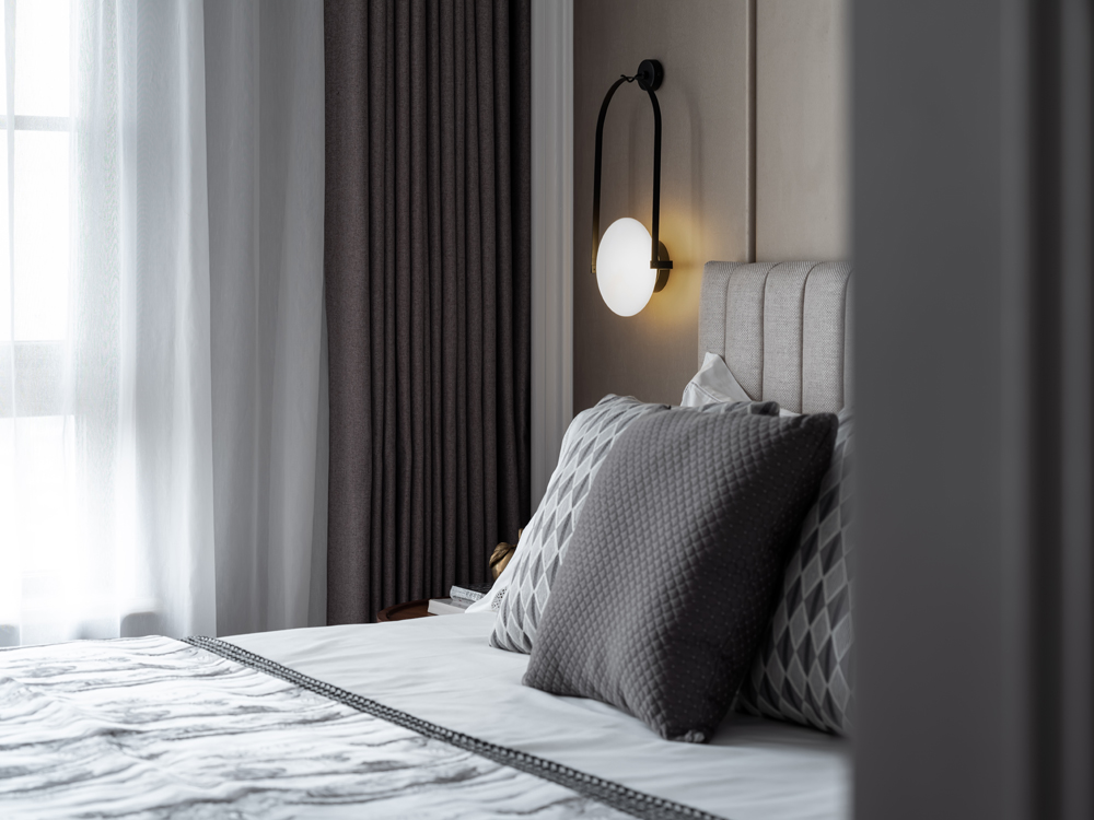 長輩房用色沉穩樸質,米色柔和,灰色大氣,勾勒舒適尊享的氛圍,現代簡約形制壁燈造型精巧,暖色光暈烘托起溫馨有愛的生活場景。