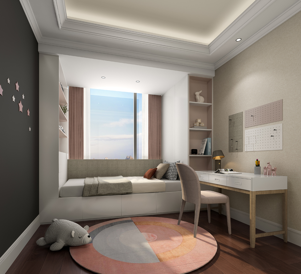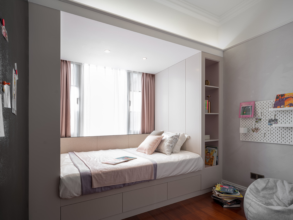 女兒房通過櫻語粉制造童話般的情境,呵護柔軟的公主夢。設計考慮實用與童趣并存的狀態,洞洞板置物架與黑板墻相得益彰,豐富多樣的畫本、值得珍藏的兒童畫作,讓孩童的天真爛漫盡顯眼前。