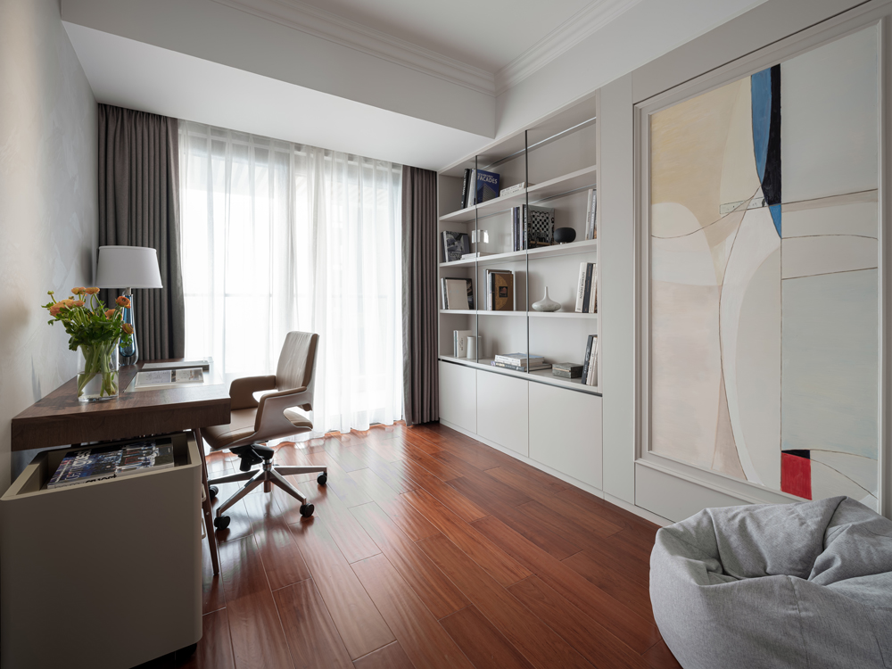 多功能房兼顧書房、臥室、休閑區的自由切換,隨著抽象手繪畫推拉門的移動,空間瞬間轉換成下翻床休憩模式,隨處可見的書櫥設計構設起家人隨時隨地都能看書的休閑場景,盡顯實用美學的內在魅力。
