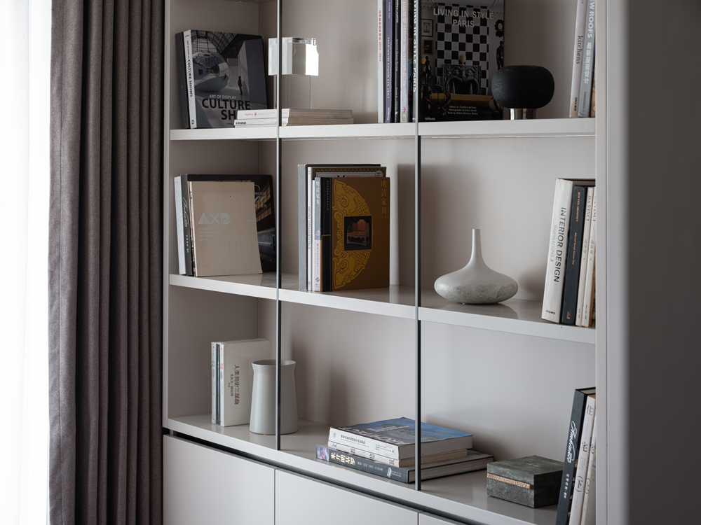 2.在客餐廳分別設計了對稱陳列的儲物柜,解決居家收納問題,同時在空間的各個角落設計了書櫥,滿足居者隨時隨地可以拿起書籍翻閱的場景化需求。