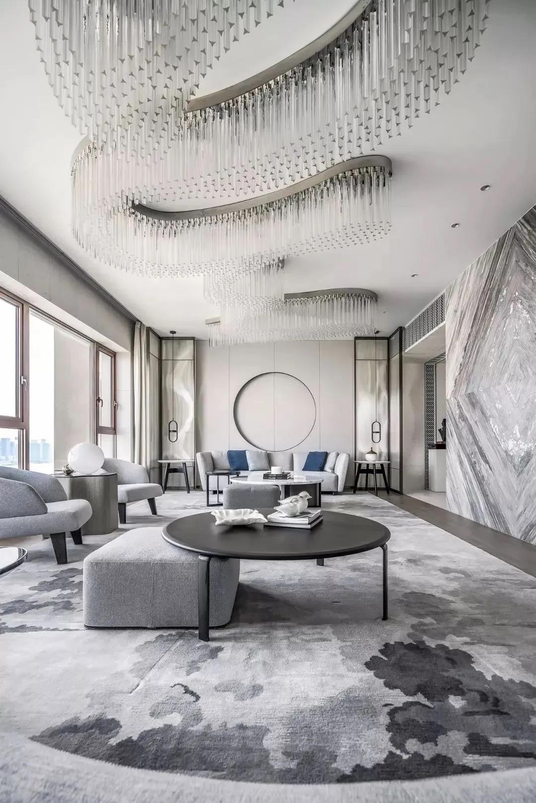 客廳線條優雅的水晶燈,以輕盈的姿態預告了夜晚的浪漫情調。對稱而列的儲物架充當書海里的配角,席地而坐翻弄書頁也是一幅靜美溫柔的畫面。