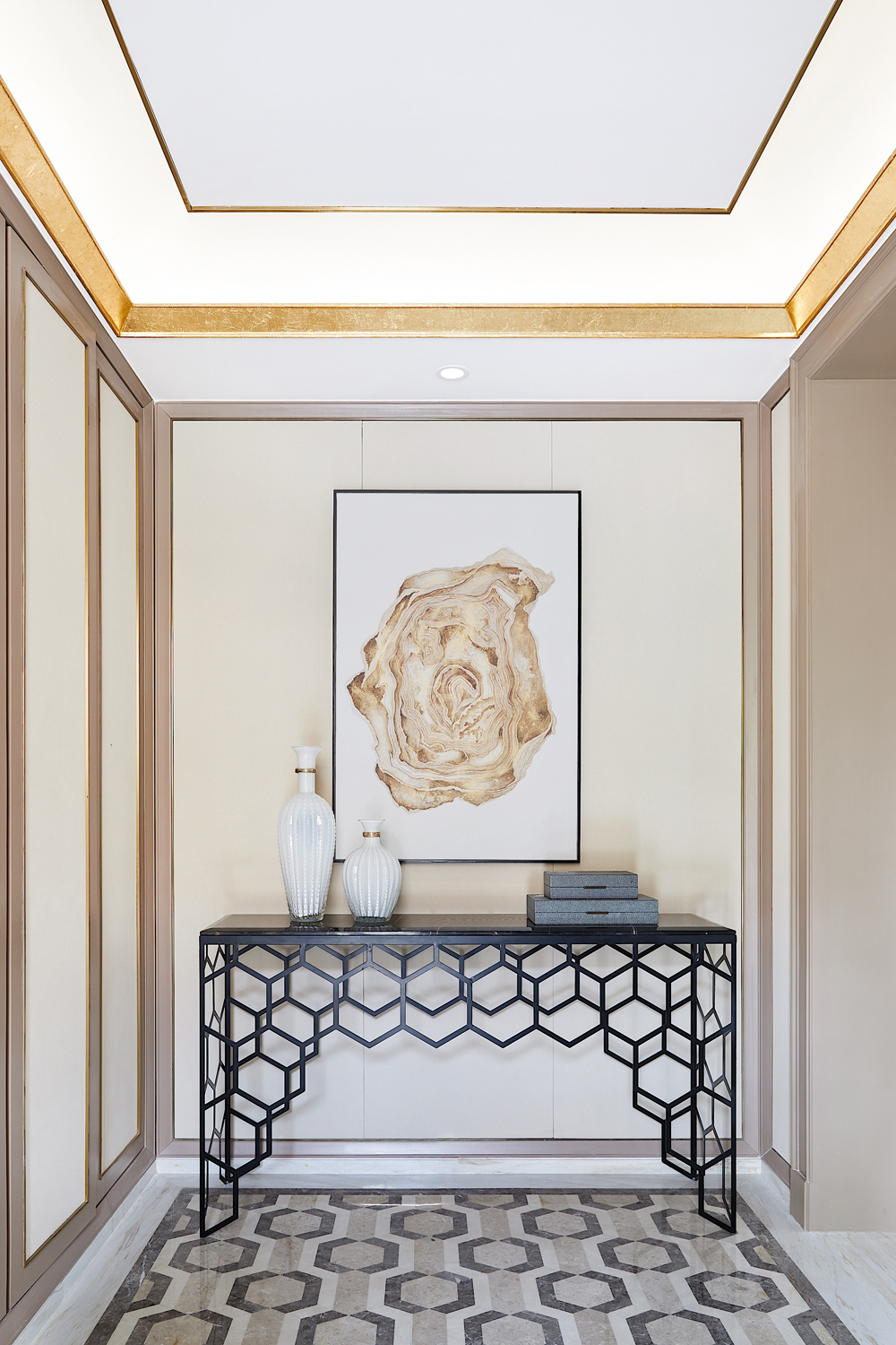 蜂巢元素如同一根線,串聯起整個空間的故事性。初進家門,從硬裝到軟裝,從玄關端景到天花,地面,再到空間中的軟飾,蜂巢元素不斷變化,延申,以獨一無二的視像訴說家的美好。
