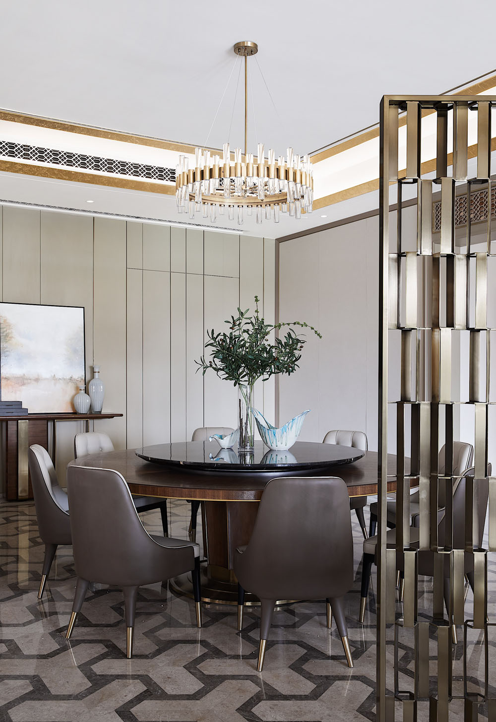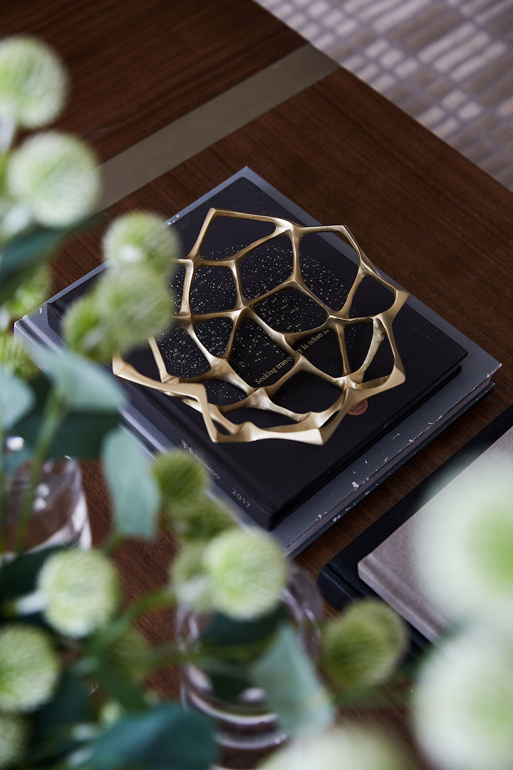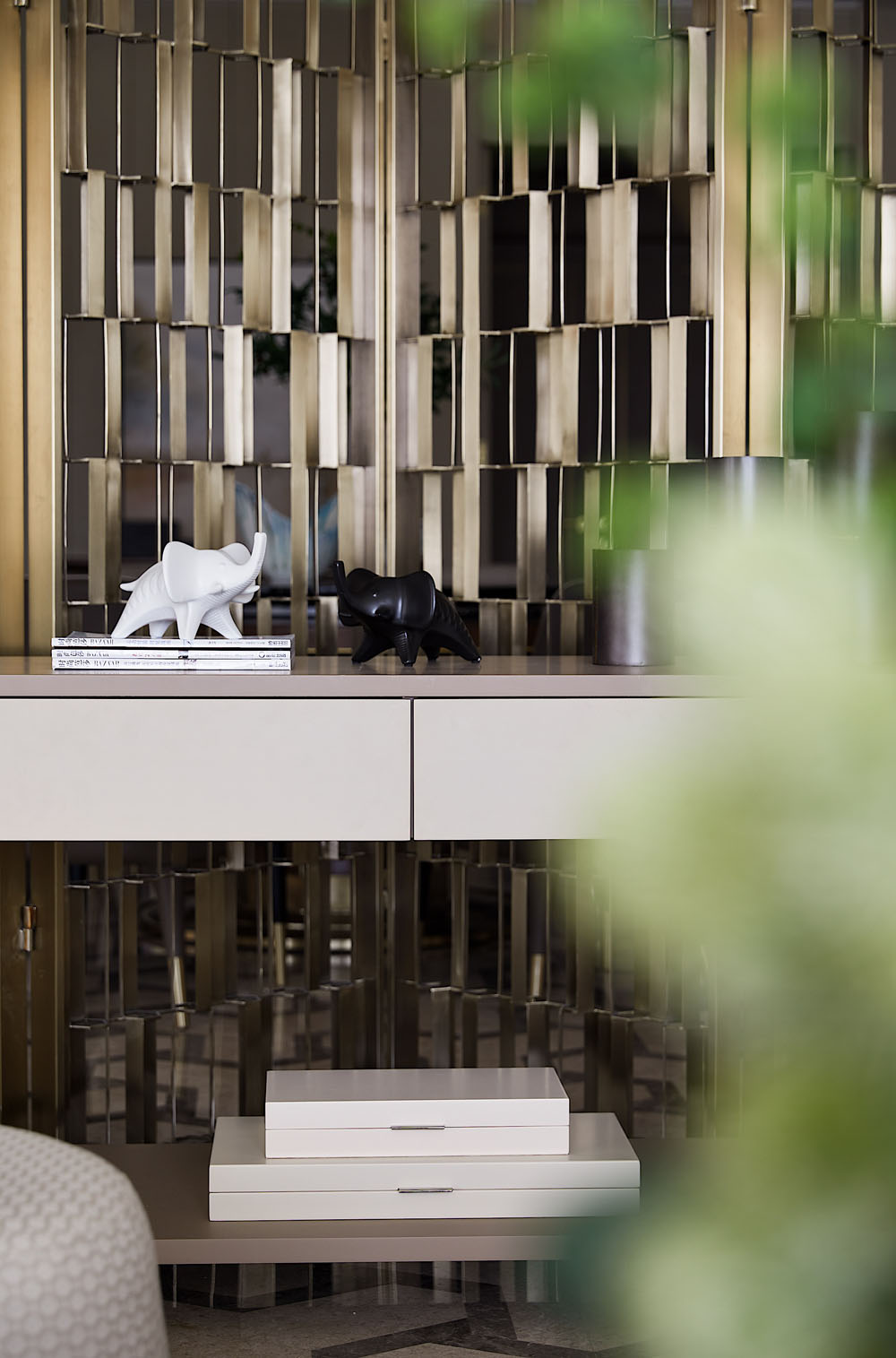 “蜂巢”的靈感概念在空間不斷延續(xù),小圓墩上的暗紋肌理依舊能看出設計所想表達的家的凝聚力和安全感。金屬鏤空隔斷增加了視覺上的層次,和質地考究的黑金碗蓮擺件一起讓家的精致氣息脫穎而出。