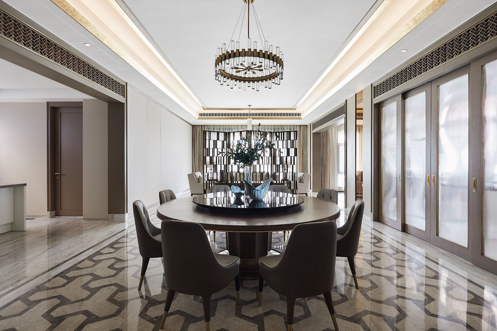 餐廳在米色的基礎上添加了更沉穩(wěn)端嚴的一筆,描摹家族的餐饗禮序。美是很抽象的東西,但生活的美好模樣卻可以具象。香氣誘人的料理端上桌,一家人聚在一起,水晶燈揮灑星光如水,于高朗的情境中悠然感受人間煙火氣。