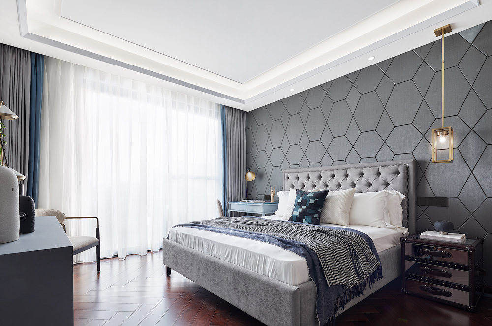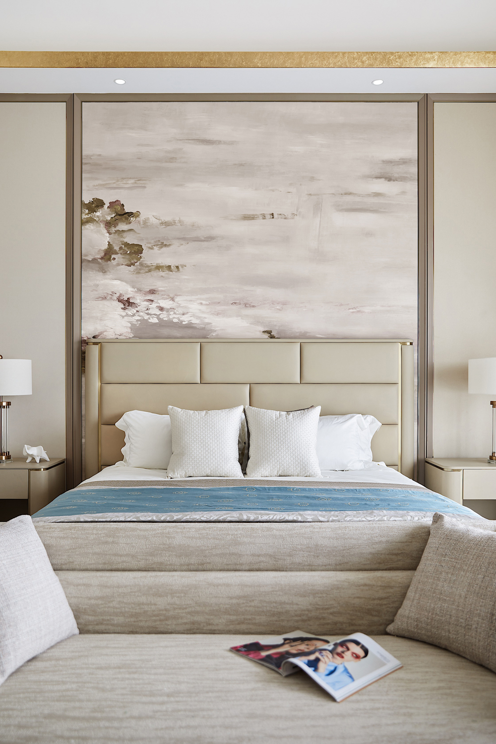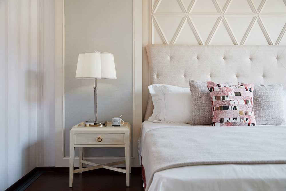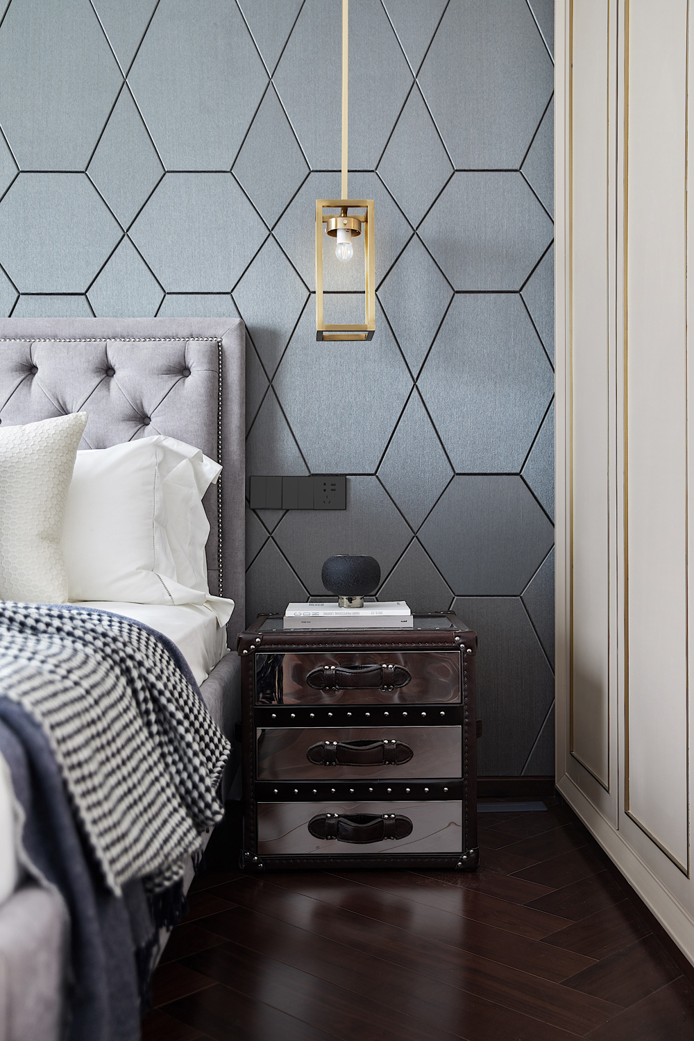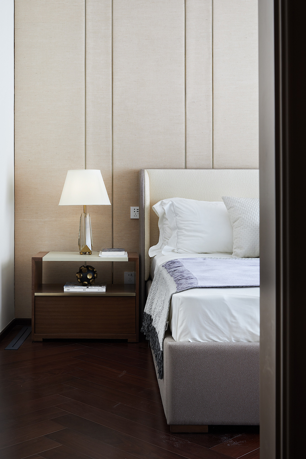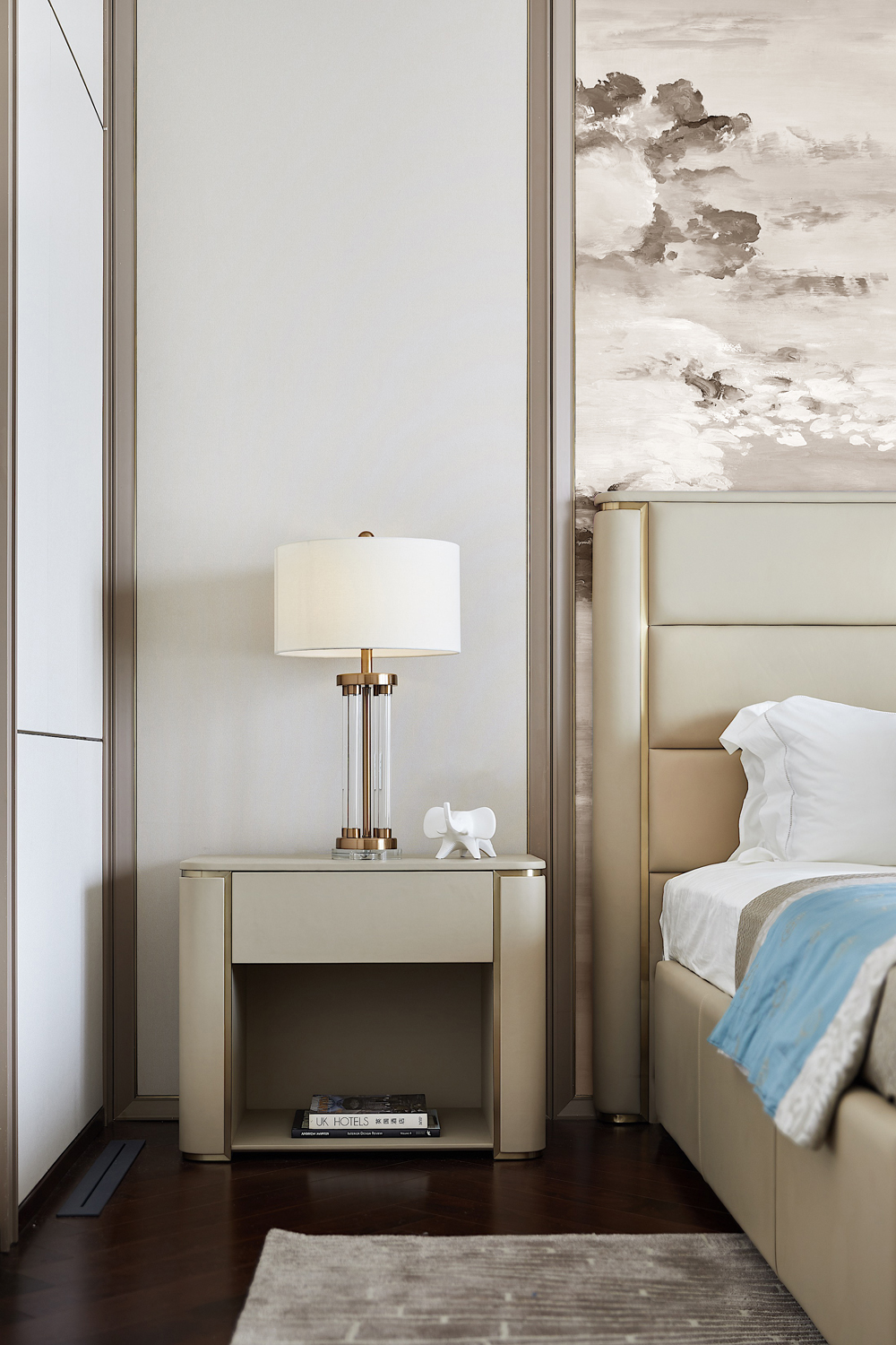 床頭以輕柔的軟包打造,趣味多元的幾何線條勾勒出個性的視覺張力,令空間在低飽和度的色彩中跳脫出輕靈的節(jié)奏感,生活與藝術在此靜謐融合。