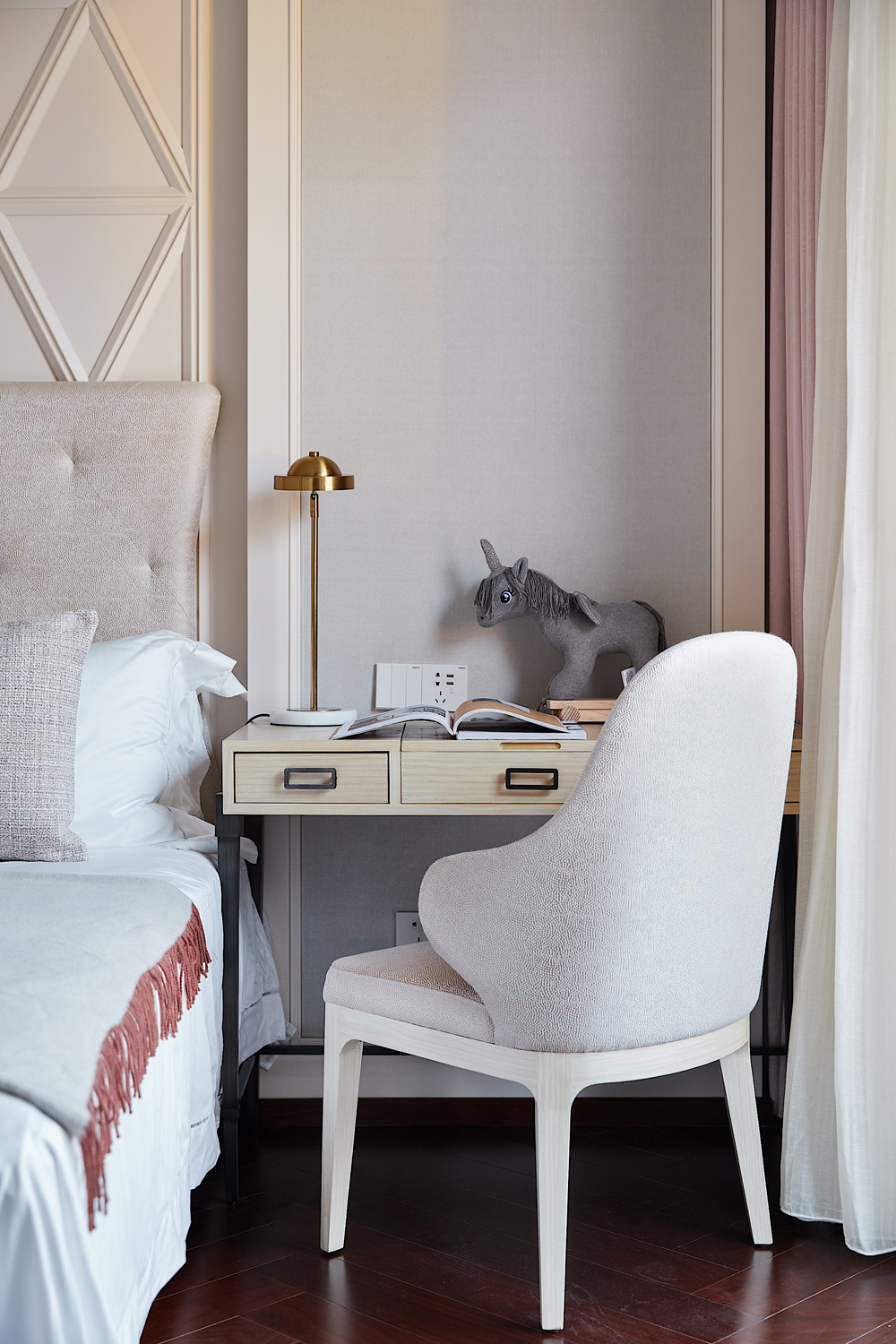 長輩房設置在一樓,給予長者通行走動的便利,同時也多了與自然相擁的機會。全明落地窗攝入更多的光線,靜靜感受生活明媚的美好。米色調統籌了空間視覺的舒適度,設計用精簡的家具取代華而不實的堆砌,空間里流連著簡凝清雅的氣質,寧然而愜意。