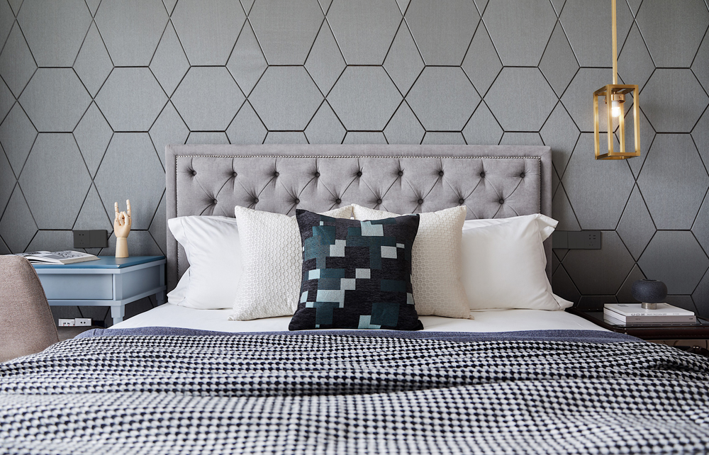 男孩房床頭背景是經過變幻后的蜂巢概念,規(guī)整的幾何排布益于孩子思維的拓展開發(fā),不同色塊的組合與千鳥格的搭配,是一種潛移默化的美學投射,孩子自由成長不受限。