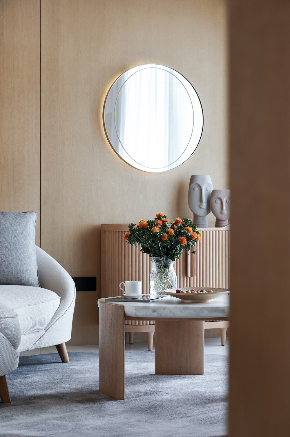 飄窗小景,圓月型簡約燈飾,一把米色單椅搭配中灰色幾何地毯,隨處可見的精尚與優雅氣質悄然流淌。一簇明黃色花束的點綴,為靜謐的空間增加了明媚如春的靈動美好。