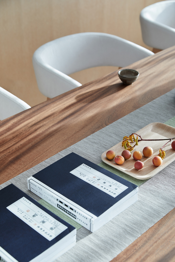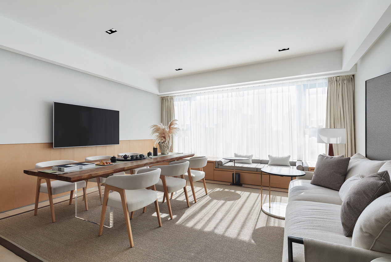 設計師徐靜充分考慮了業主行業沙龍、閨蜜下午茶、料理烘焙等個性化需求,織物與木質的完美組合,自然而質樸,在不斷變幻的光線中,設計成就了迷人的色彩美與律動美。