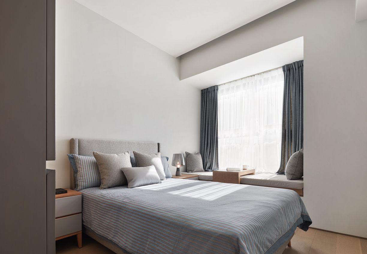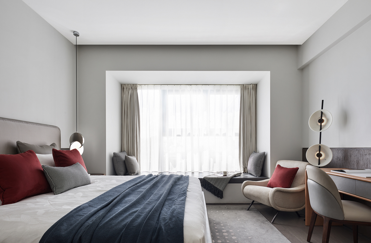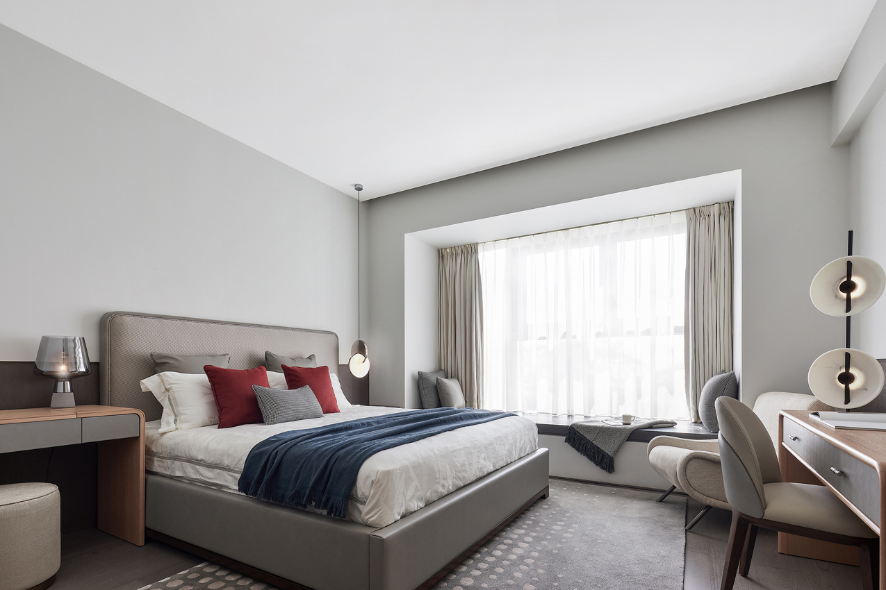 海德格爾說:“詩意的棲居,不應該只是觀看的詩意,而是居住的詩意。”設計通過深淺不一的灰色打造舒適奢享的空間氛圍。富于肌理與光澤的床品、造型精巧的臺燈,窗臺小憩的休閑場景,都經過設計師精心的考量,為居者呈現定制化的品質體驗。