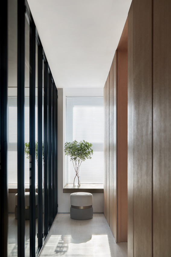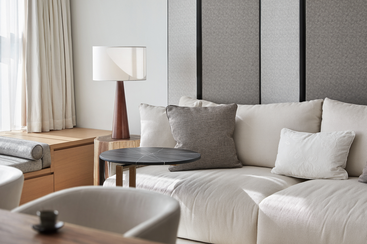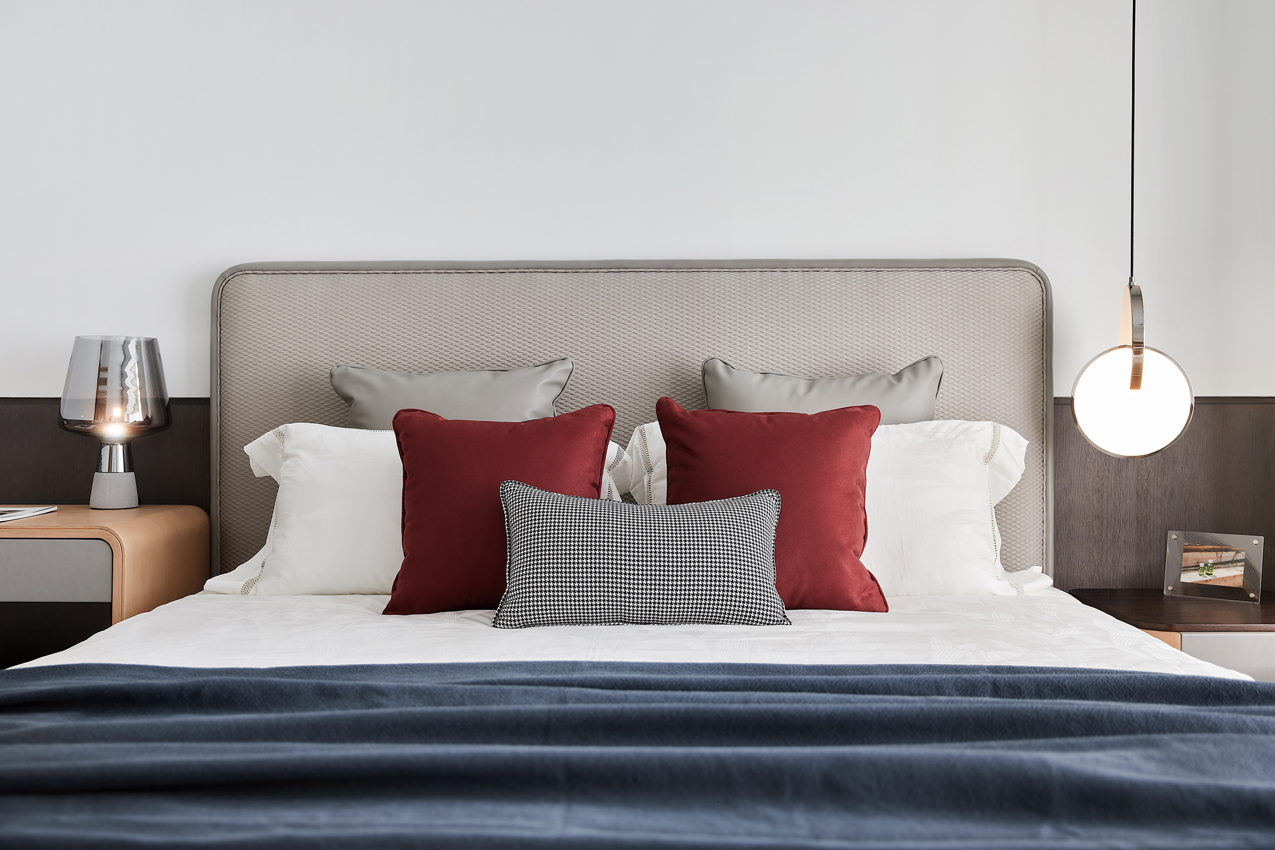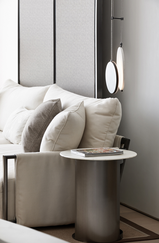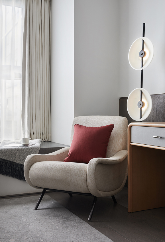 海德格爾說:“詩意的棲居,不應該只是觀看的詩意,而是居住的詩意。”設計通過深淺不一的灰色打造舒適奢享的空間氛圍。富于肌理與光澤的床品、造型精巧的臺燈,窗臺小憩的休閑場景,都經過設計師精心的考量,為居者呈現定制化的品質體驗。