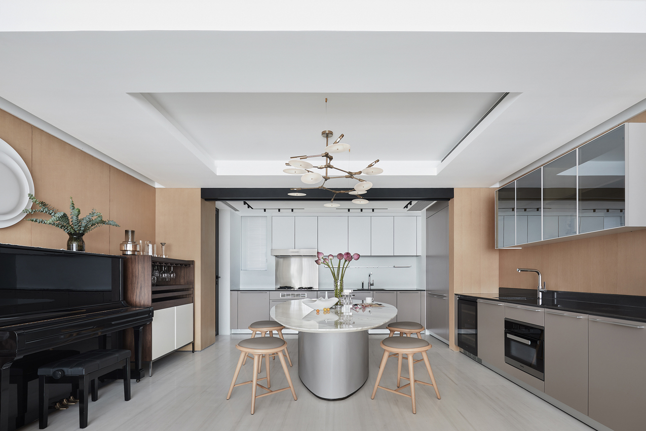 在設計師徐靜看來,當設計更多地在審視空間的互動性和人的參與感時,便有了家的人情味。開放式餐廚布局增加了更多互動的場景感,女兒心愛的鋼琴與簡雅實用的酒柜倚墻而設,將每一寸空間利用到極致,藝術與生活于此實現了潤物無聲的自然交融。