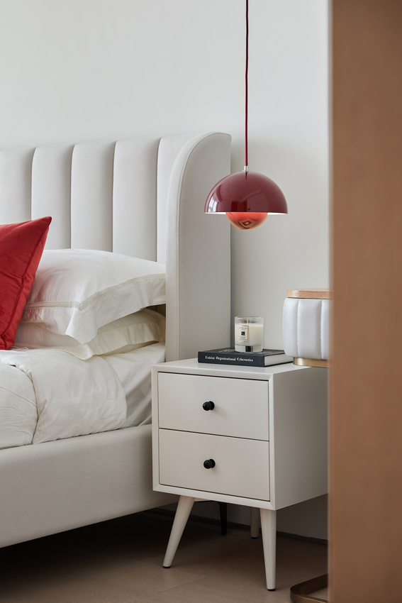 從審美品位到材質把控、風格定位的選擇上,設計師徐靜始終在不斷探求更加美好的設計呈現。光影隨意灑落于床邊,與精心調配的典雅藍和復古紅搭配出簡寧質感。適度留白給予居者更多的想象,在未來的日子里,用愛與品位去慢慢填滿。