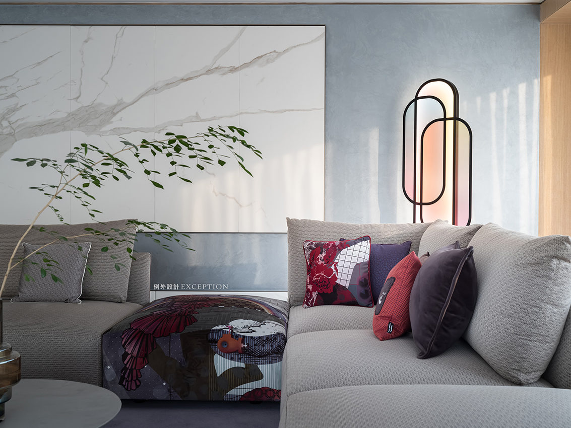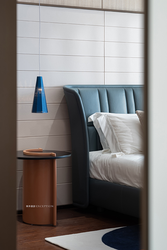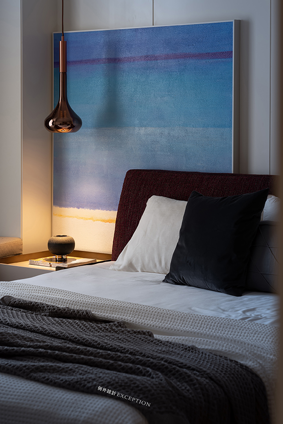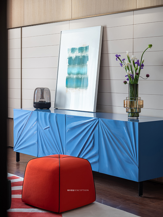 層次分明的藍像一根線,串聯(lián)起居者日常里有關美、有關格調、有關體驗的故事,如珍珠般在歲月的流淌中耀眼奪目。在光影游戲中,靜下心來你會發(fā)現(xiàn)那些貝殼紋理的柜體、抽象簡潔的掛畫以及如花朵盛放的地毯,就是一種充滿藝術與韻律的組合,在不同的時分去觀看,都有笑意和溫暖從眼中跑出來。