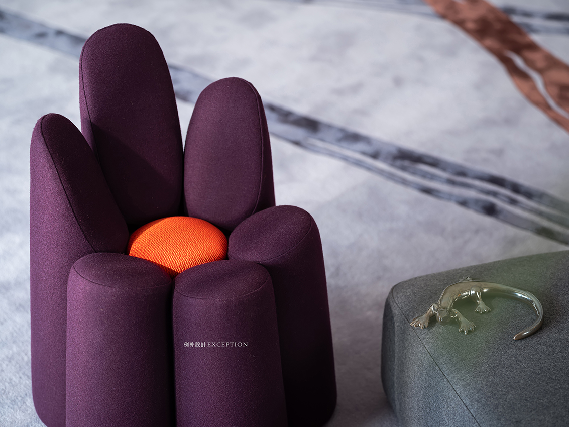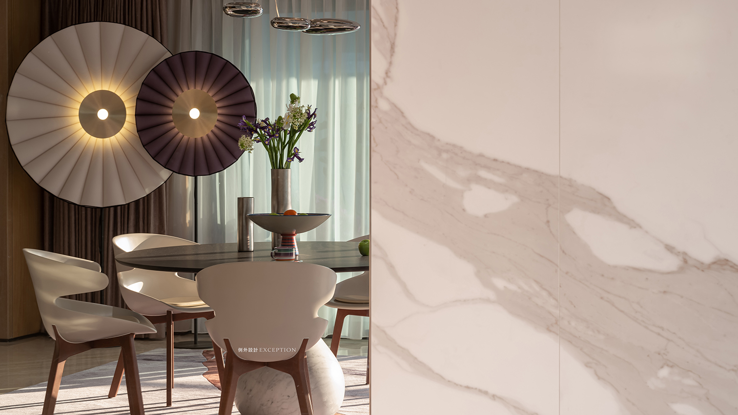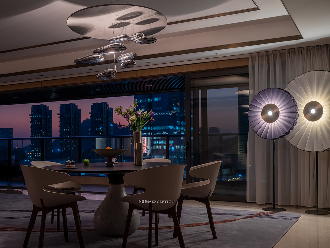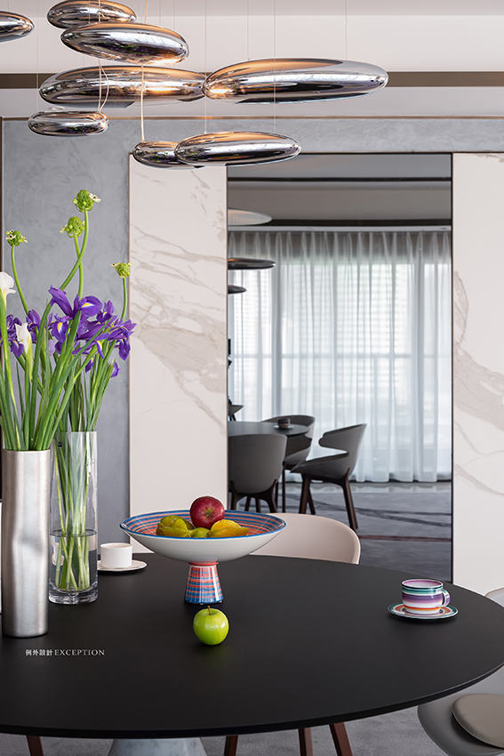 空間是有溫度和氣質的,如同旅途的風景,需要你親自抵達,細細領會。reine紫色太陽花落地燈在餐廳一角營造出柔和的光影,紫色的花枝被陽光輕撫,在銀色游魚燈影下悠閑搖曳,六人位餐桌期待著川湘魯粵的各色風味,食物的香氣縈繞鼻尖,芳香因子在井然有序的空間里得到最大化釋放,正如設計師徐靜所說:幸福往往就藏在這平常的煙火氣里。