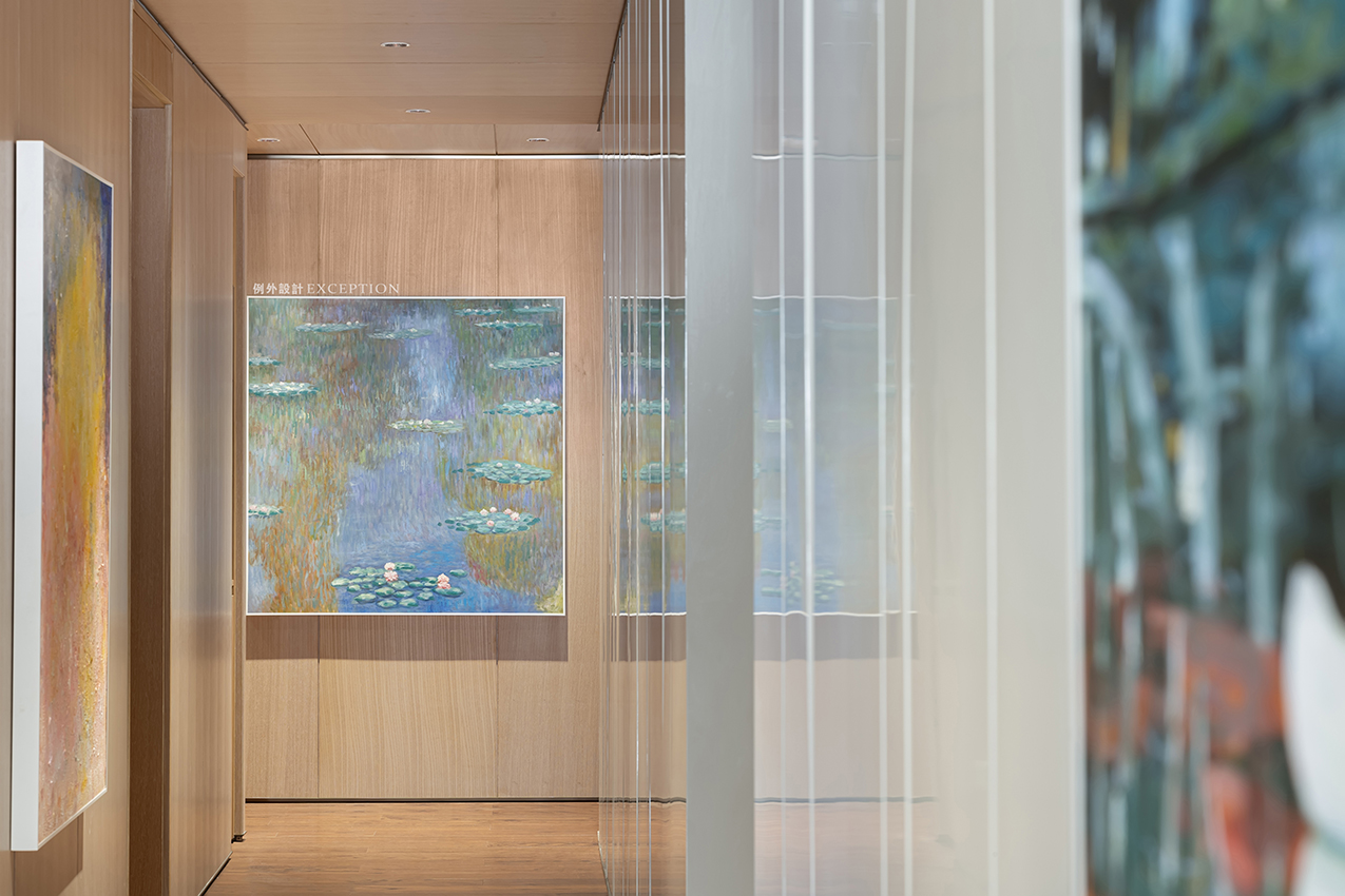 莫奈的睡蓮在廊道盡頭瀲滟著波光,多伊格的白色獨木舟在離奇怪誕的風景中天馬行空。原木色沉淀出空間的延伸與張力,于藝術與生活之間探尋深層的感知奇遇,過廊片刻的停留,便能收獲一份小確幸。