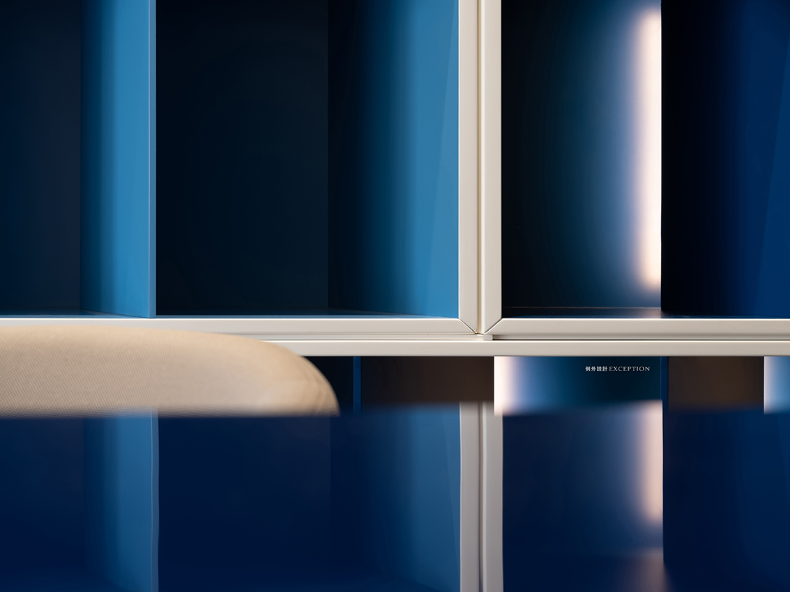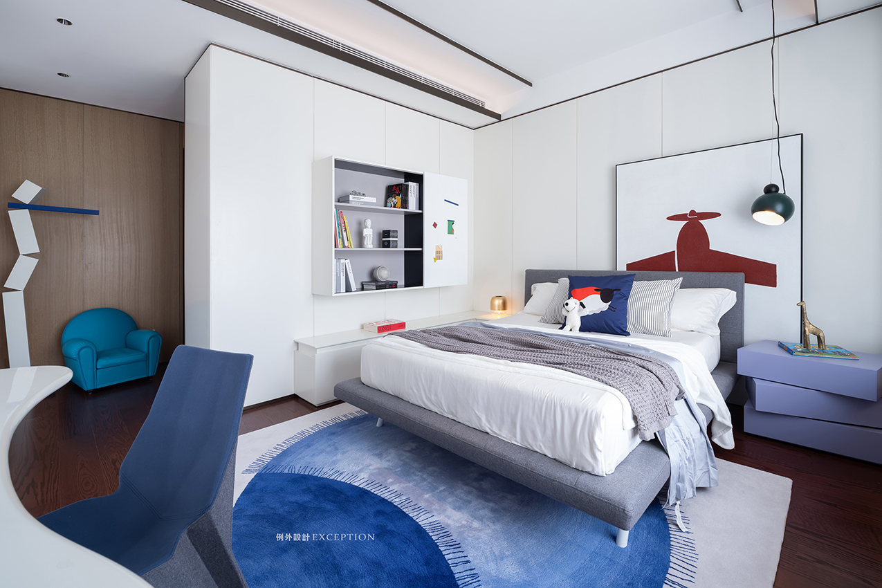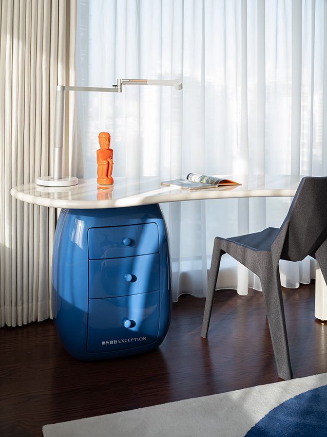 推開門,清風和陽光悄悄溜進來,不同層次的藍色在光影中融合、交疊,有大海的深邃,亦或是天空的晴朗,編織成一派自然隨性的清爽。建筑體塊構成的寶藍色造型書桌,以合適的角度容納雙人辦公、小孩互動的場景。看世界的角度對了, 哪里都是風景。