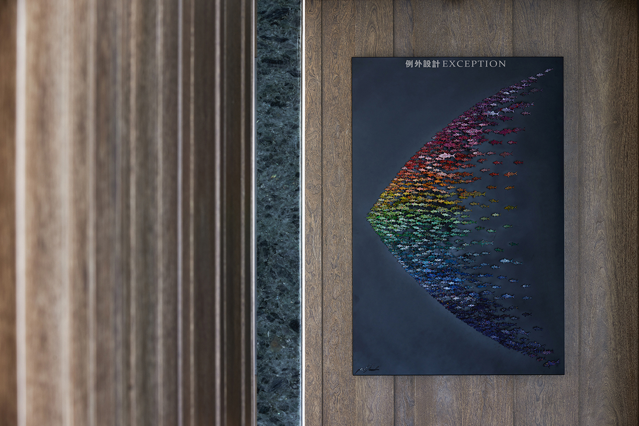 玄關盡頭是藝術家 Joel Amit 的藝術掛畫,由成百只魚的造型游弋成一只全新的七彩魚,高低錯落,頗為生動明艷,作為整個空間的視覺焦點,躍動著如魚得水的美好寓意。