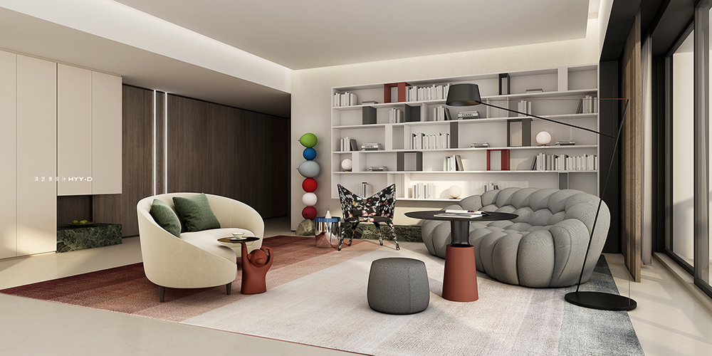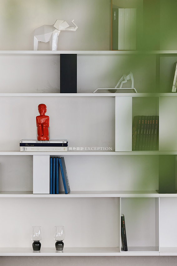 紅棕色漸變地毯鋪就一室的俏皮與優雅,整面米色開放式櫥柜,滿足了日常的展示與收納場景。書櫥中的動物飾品呼應著隨處可見的自然氣質,不經意間一瞥,便能激發出生活中的幸福靈感。
