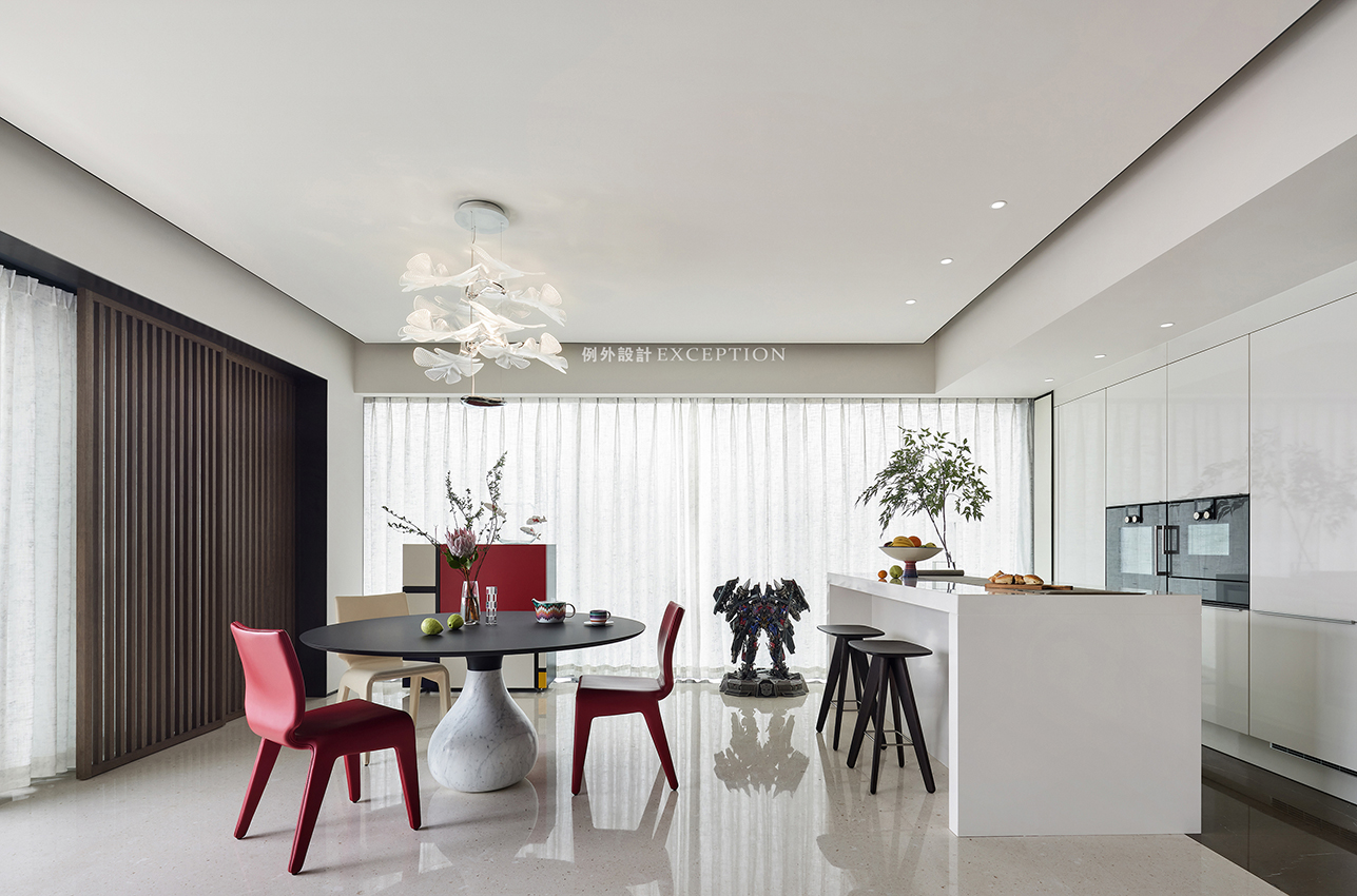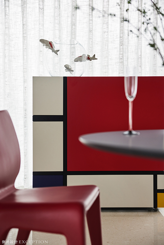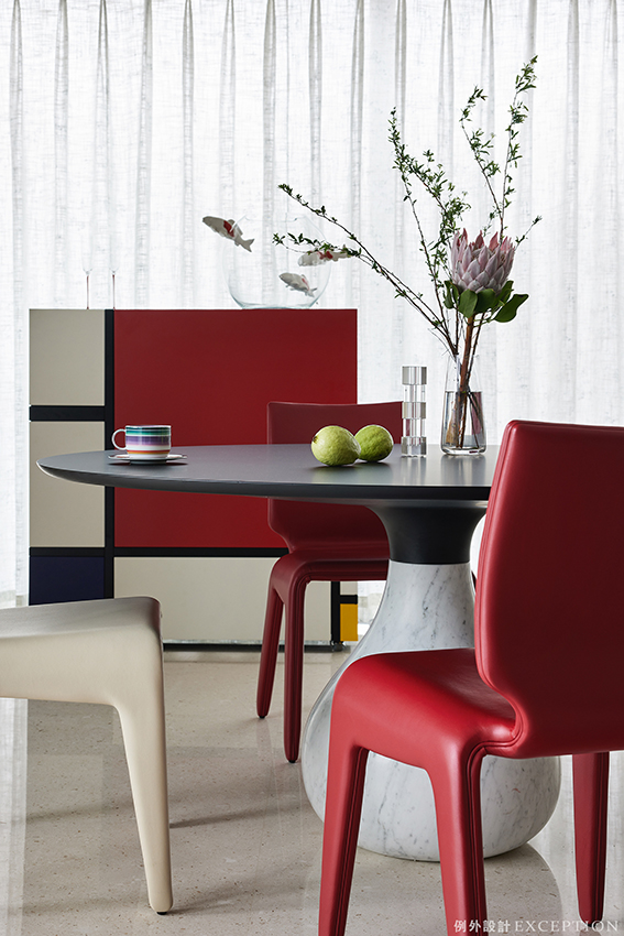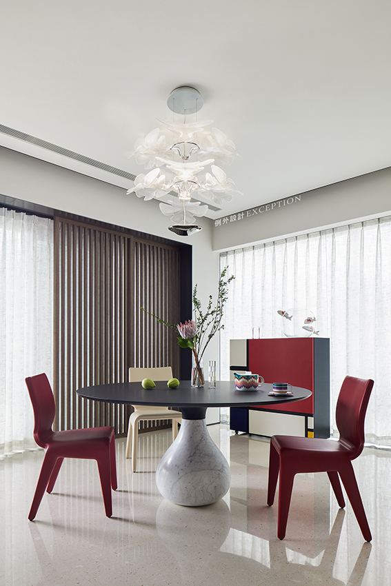 蒙德里安經典的紅黃藍白元素融入餐邊柜的創意中,成為餐廳一隅的經典。紅白相配的皮質餐椅圍合黑白拼接的水滴形餐桌,豐富了家人三餐四時的藝術享受。雅白花朵吊燈更是將這一氛圍烘托得更加濃郁、澄澈。格柵屏風朦朧中透露詩意,空間強烈的色彩所調和的韻律感,成為讓人深情迷戀的所在。
