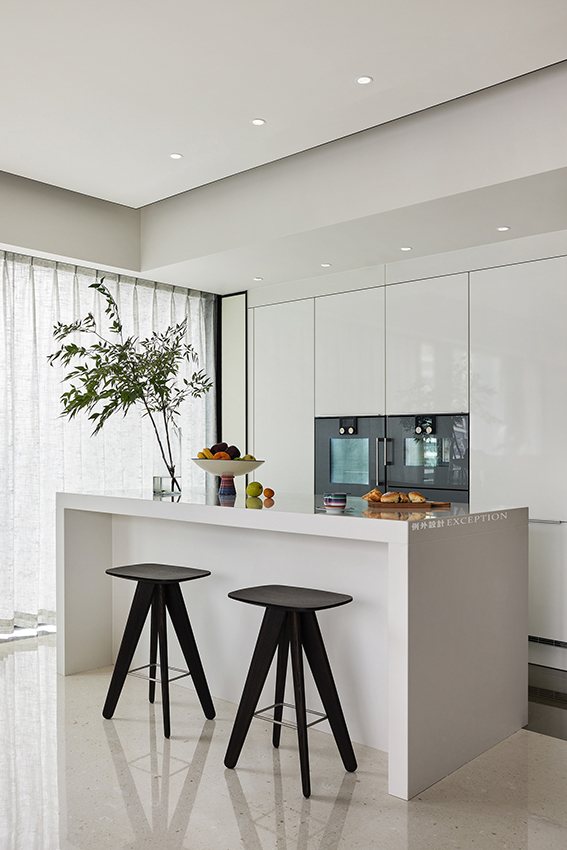 在一片純白的視像中,設計抽離了多余的表達,留白更多驚喜迎接居者的創造。夫妻倆的獨處時光,制造彼此心領神會的浪漫,默契在空間游走,陽光隨薄紗流轉,藝術成為空間里流動的一道人文風景。