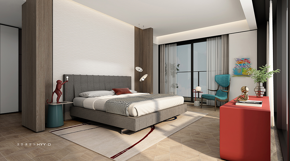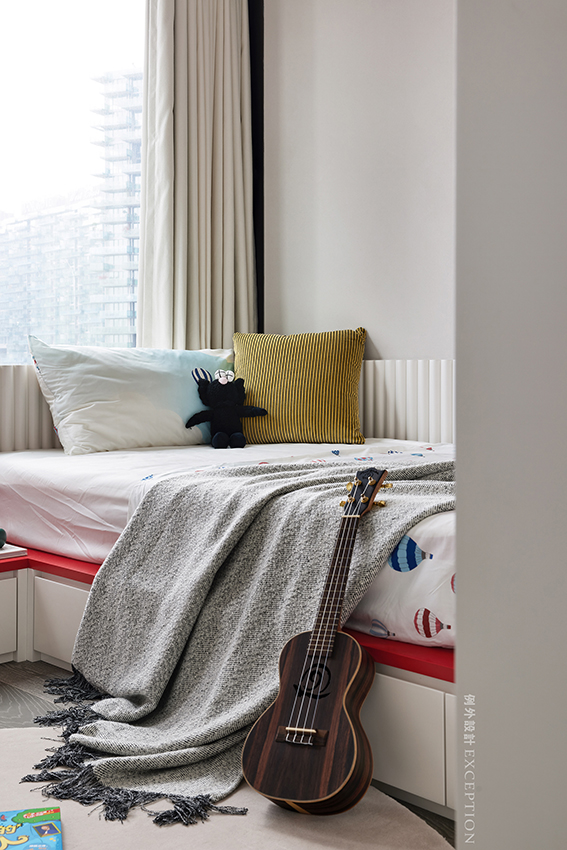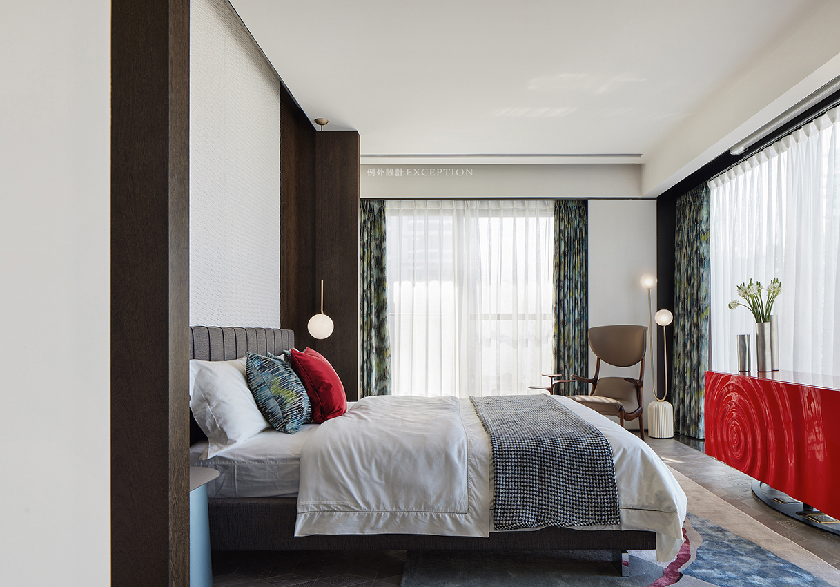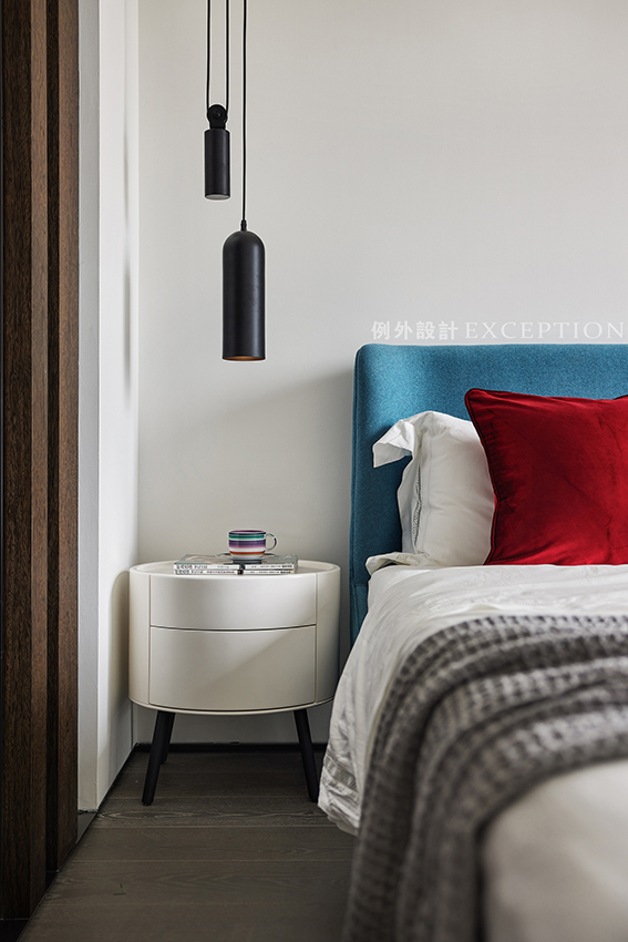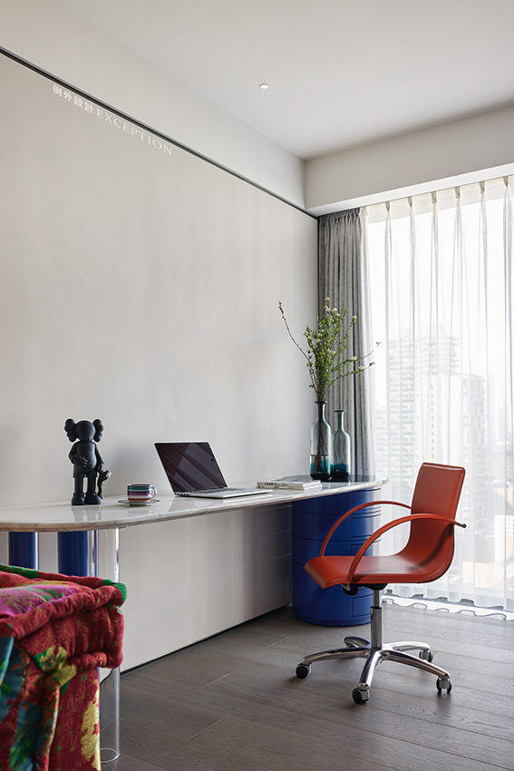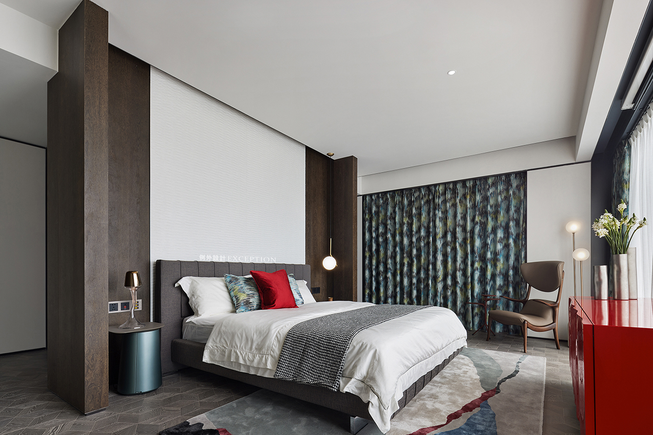 主臥延續玄關空間的藝術線索,床頭墻面白色群魚自在暢游,紅色裝飾柜一圈泛起的漣漪將思緒拉進自然的呼吸中,再次強化了如魚得水的靈感設想。作為一個私享的休息空間,一部會心的電影,一次深入的暢談,生活的浪漫情調都會生發于此,余韻悠長。