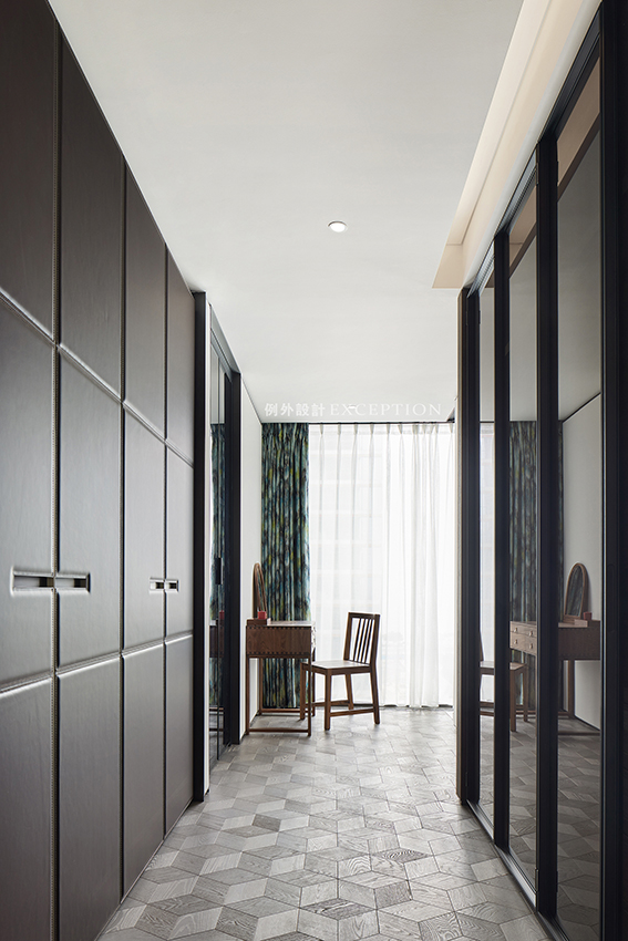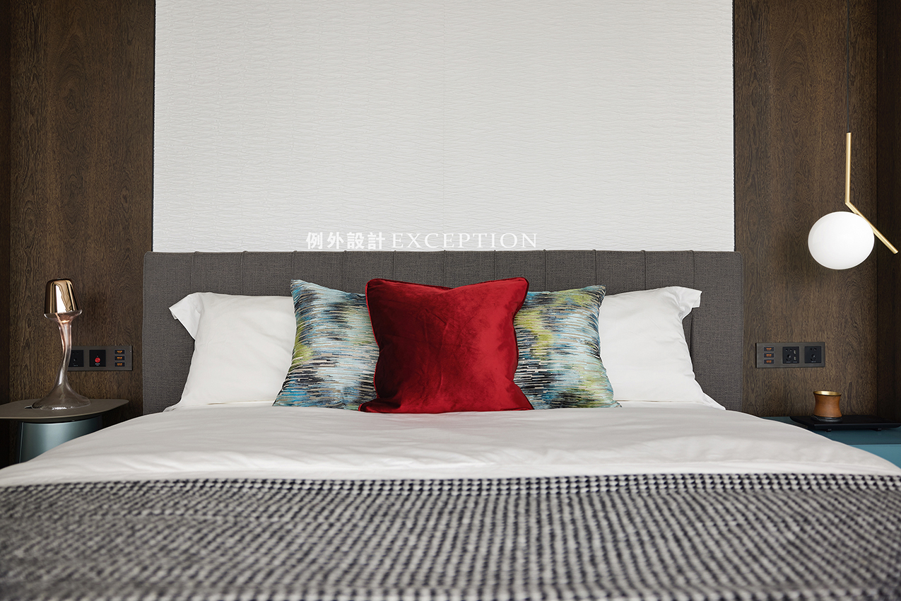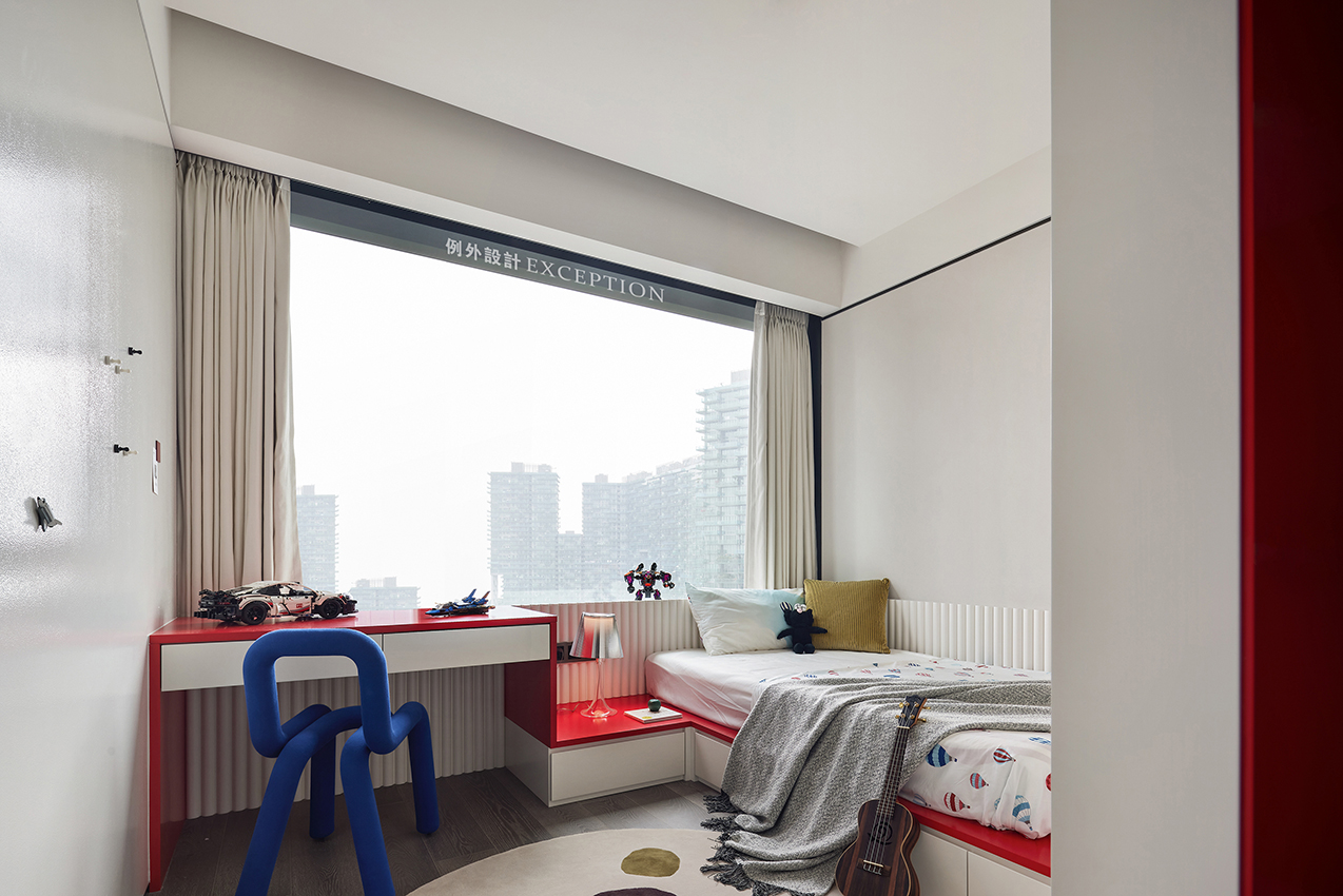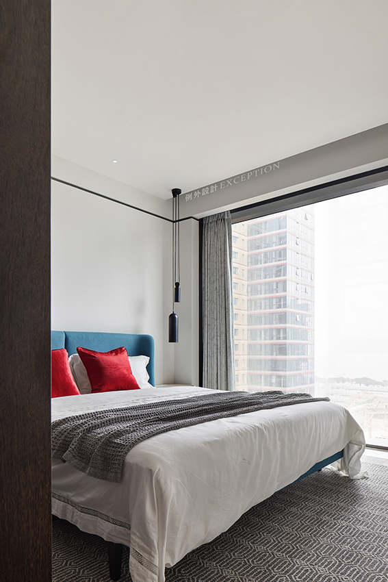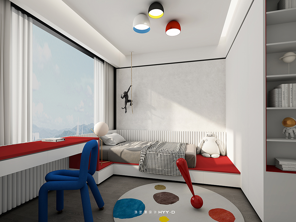 主臥延續玄關空間的藝術線索,床頭墻面白色群魚自在暢游,紅色裝飾柜一圈泛起的漣漪將思緒拉進自然的呼吸中,再次強化了如魚得水的靈感設想。作為一個私享的休息空間,一部會心的電影,一次深入的暢談,生活的浪漫情調都會生發于此,余韻悠長。