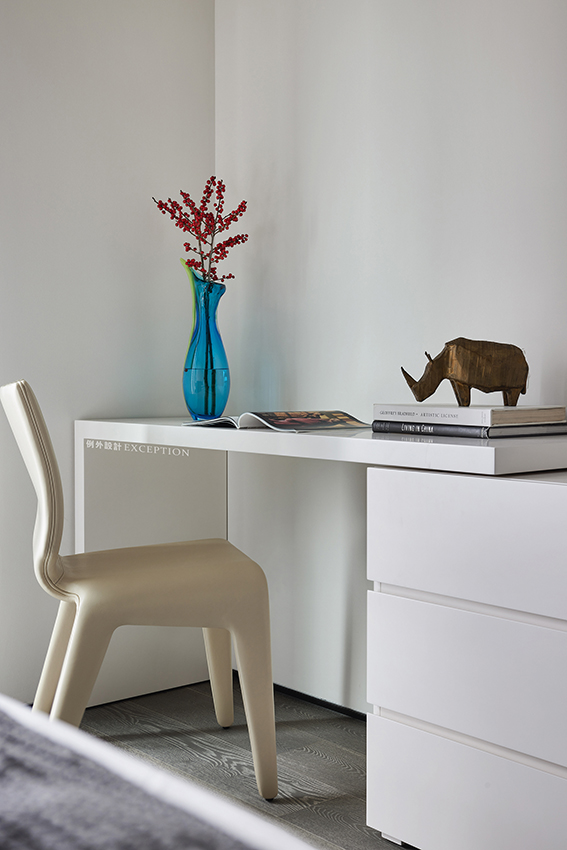 長輩房去繁就簡,通過米白的家具和床品營造干凈純粹的清韻。祥和喜樂的紅色搭配雅致的藍色,加上小巧的飾品,寥寥數筆就勾勒出藝術而不失生活氣息的空間氛圍。