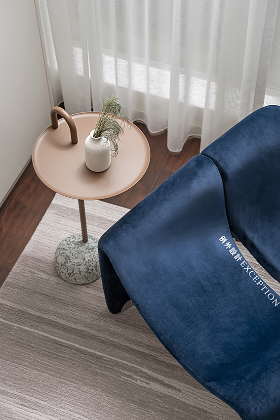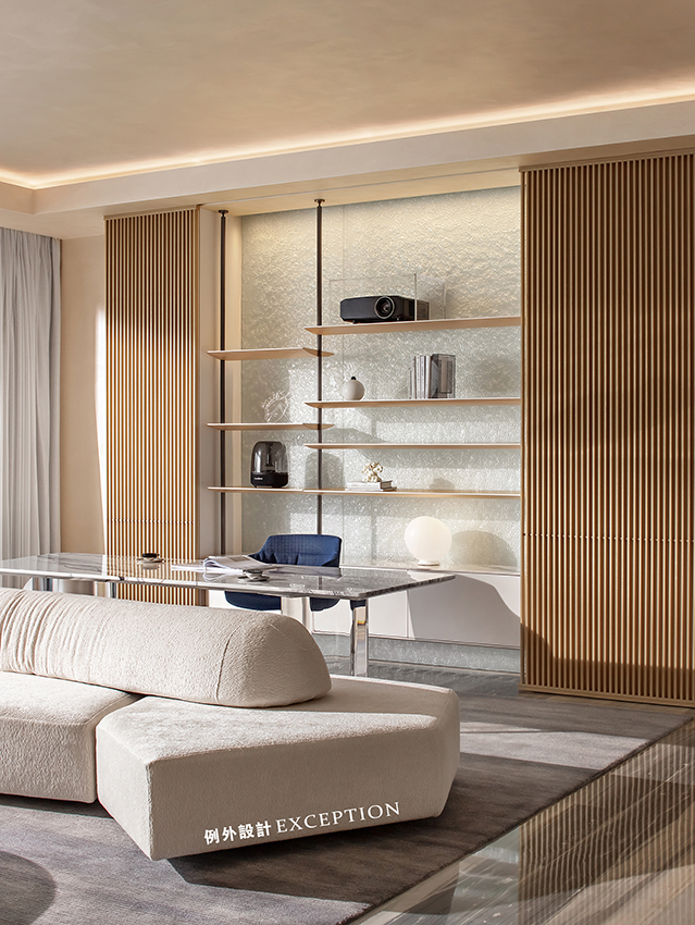 當滿目海景遇上懂生活的人,空間的故事又多了一層韻味。雙向而立的沙發成為客廳和書房功能的鏈接,創造出更加豐富的生活場景。家人可以一起看電影、紀錄片,一旁的閱讀區也是放松身心的不錯選擇,或者在單人椅側目而望,光影與自然,人情與況味,在這里靜靜交織。