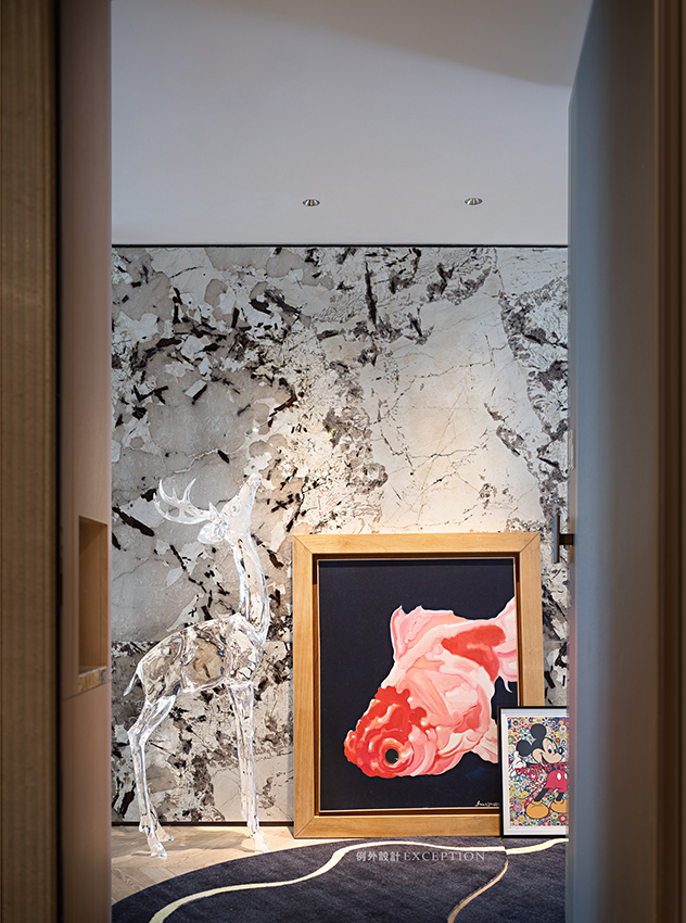 進入玄關,眼前斑斕的大理石背景墻紋理行云流水,像春日里碧波蕩漾的湖面,一尾嫣紅靈動的魚游弋出如魚得水的寓意,水晶小鹿仰頭輕嗅陽光的味道,微風吹過,滿目溫柔。推開家門的那一刻,看到這些栩栩如生的藝術作品,一天的煩惱都拋到了腦后。