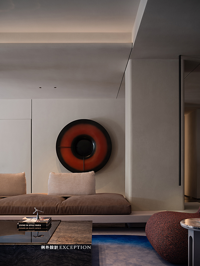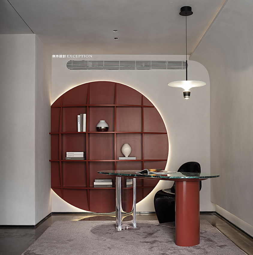 設(shè)計以居者的生活態(tài)度為藍(lán)本,搭建起更深入人心的生活方式??蛷d更多地是家人一起互動的空間,格調(diào)高雅,品位獨特。紅色壁爐將對生活的熱情完美展現(xiàn),大理石弧形茶幾與紅色邊幾高低錯落,電動窗簾閉合后,室內(nèi)外形成一種朦朧的美,在壁爐旁看書,家人對坐相談甚歡,幸福生活的厚度在時光的凝練中累積起來。