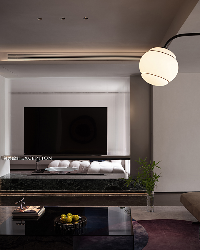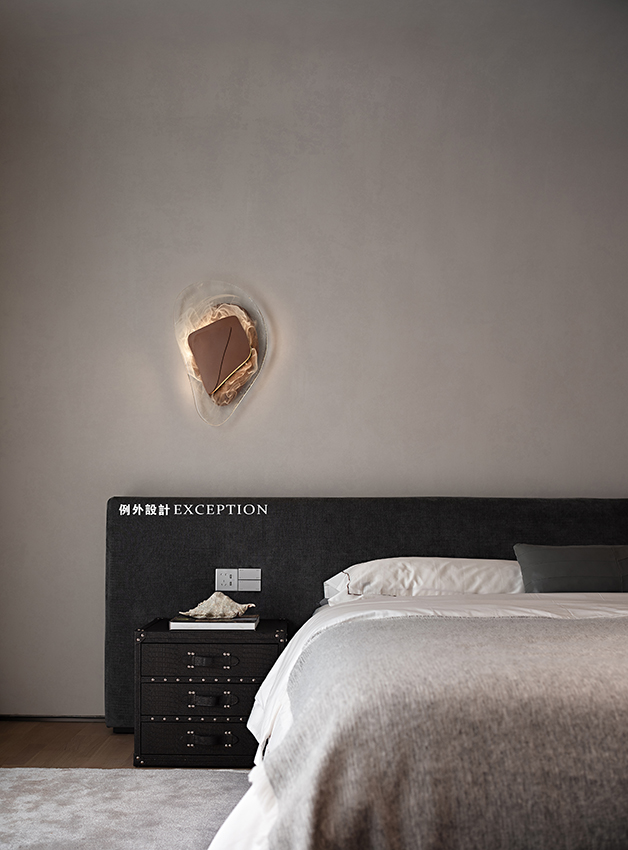 考慮到結(jié)構(gòu)限制,鴻藝源設(shè)計結(jié)合原有柱體做了超長懸空的大理石個性化吧臺,屋主可以在此小酌一杯。吧臺區(qū)石材壁燈表面印刻星球璀璨的紋理,和火星之家的主題無聲呼應(yīng)?;⌒蔚鯚艉蛪γ鏌魩缫箍談澾^的星軌,會客區(qū)的球形落地?zé)?,開啟后如明月升起,閉上眼睛想象,家化身為宇宙,隨時踏入一場星際漫游。