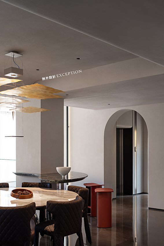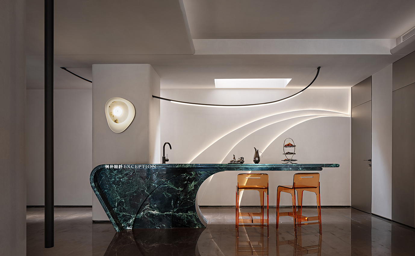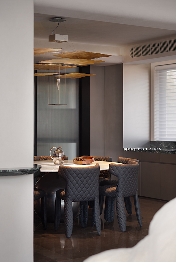高品質(zhì)的生活源于對每個細(xì)節(jié)的用心,實現(xiàn)功能和審美的統(tǒng)合。餐廳利用原結(jié)構(gòu)柱體,定制了弧形吧臺,與餐桌搭配創(chuàng)造出更多的互動感。金箔藝術(shù)燈如同火星熾熱的表面,點燃對生活的熱情,成就每一次就餐時的藝術(shù)化享受。