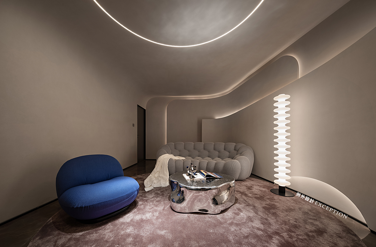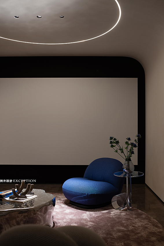影音室主要是孩子和家里的長輩的休閑空間。墻地一體的設(shè)計展示出極大的包容性,在高低、內(nèi)外中塑造相互交疊的空間關(guān)系。流線型燈光對形體進行細(xì)微的再構(gòu),墻面底部弧形鏤空增加了通透性。跳脫出傳統(tǒng)影音室千篇一律的黑與沉悶感,在一片灰白的視像中,搭配太空銀,克萊因藍(lán)和冰川灰,酷炫中又有一絲優(yōu)雅,自然而然地引導(dǎo)視覺去捕捉電影中的大千萬象。