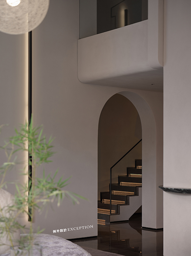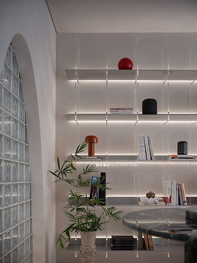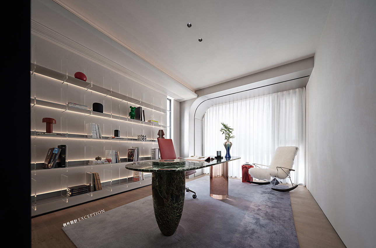 我們希望創(chuàng)造出更多和自身愉悅感受相關(guān)的東西,用溫和的姿態(tài)去發(fā)現(xiàn)生活的詩意,以多重閱讀的深度,超越幸福的想象。書房整面亞克力書架,帶來清爽的視覺體驗?;⌒尾AТu墻和樓梯間的光線相互滲透,晚上燈光亮起來,映照出屋主伏案辦公的身影,愛人上樓遞上一杯牛奶,簡單的生活影像在此刻愈發(fā)溫馨,讓人動容。