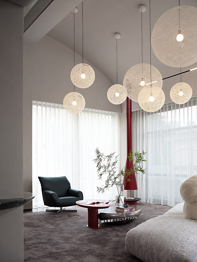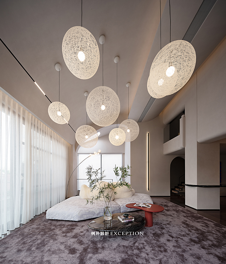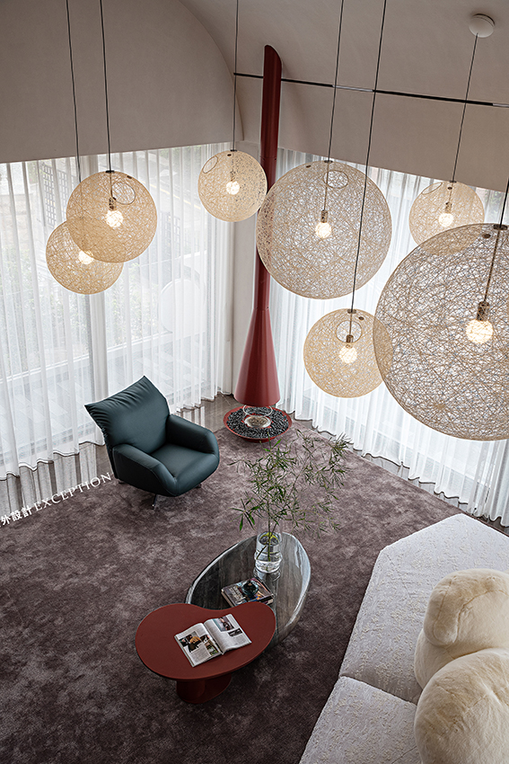 客廳利用挑空優(yōu)勢將空間格局打開,參差錯落的球形燈如同一道神秘開關(guān),一秒時空轉(zhuǎn)換,觸達(dá)磅礴大氣的浩瀚宇宙,星河璀璨。底下edra沙發(fā)栩栩如生,底座如同漂浮的冰川,白熊似乎在仰望星空,愜意享受著空間的自然與靜謐。