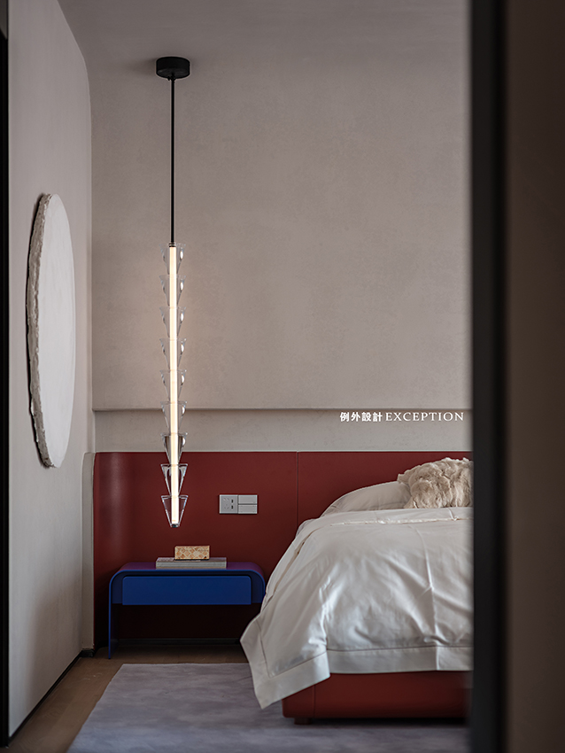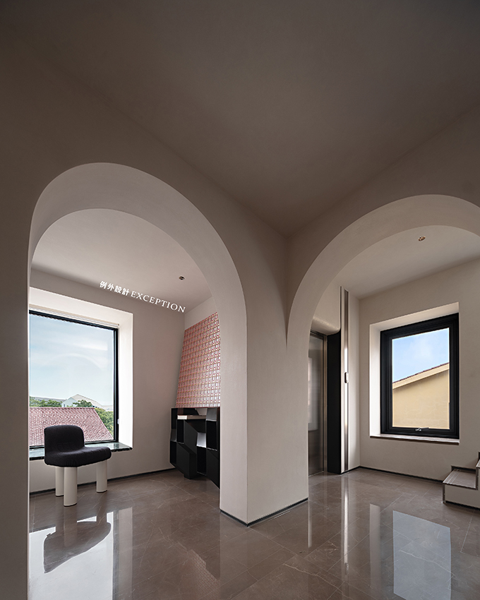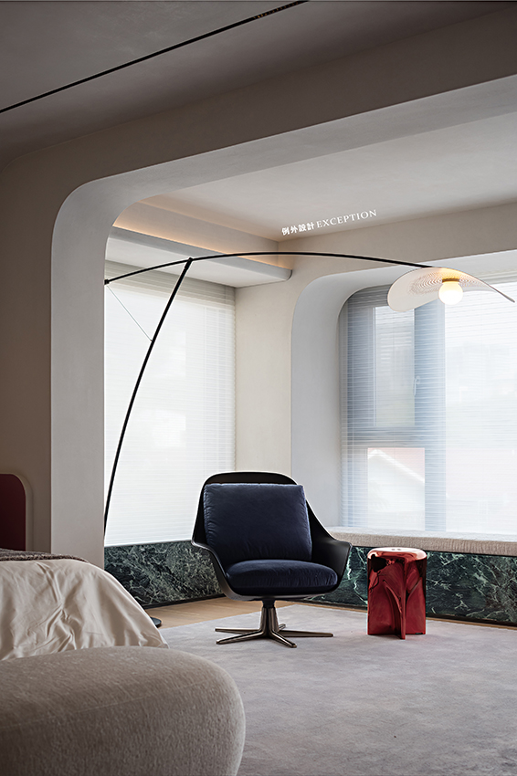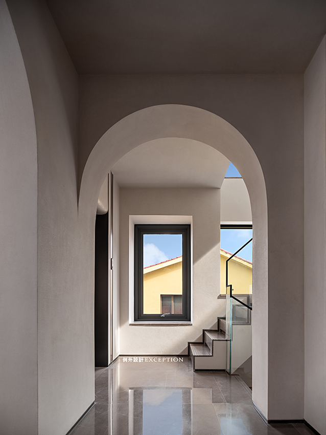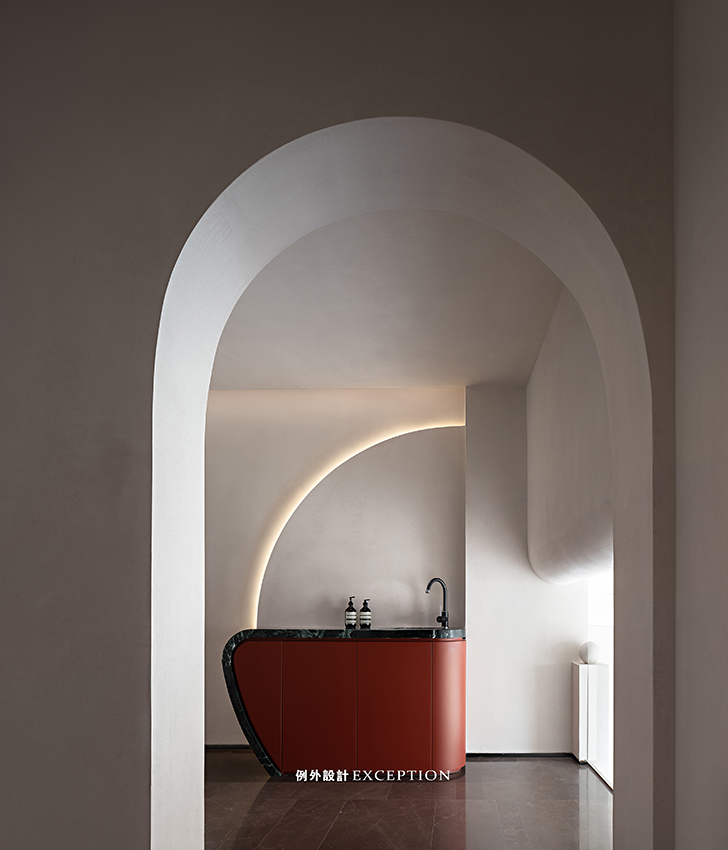 門洞的弧形處理弱化了柱體的存在,設(shè)計用借景的方法,通過不同層次的窗戶以及天窗就能看到不同的風(fēng)景,加上拱形門洞,柔化了空間感受,傳達(dá)出立體的幾何美感。置物柜上經(jīng)緯縱橫的藝術(shù)畫,有跳脫規(guī)則之外的自由之美,當(dāng)你凝視著它時,仿佛也能聽到自己靈魂深處的聲音。
