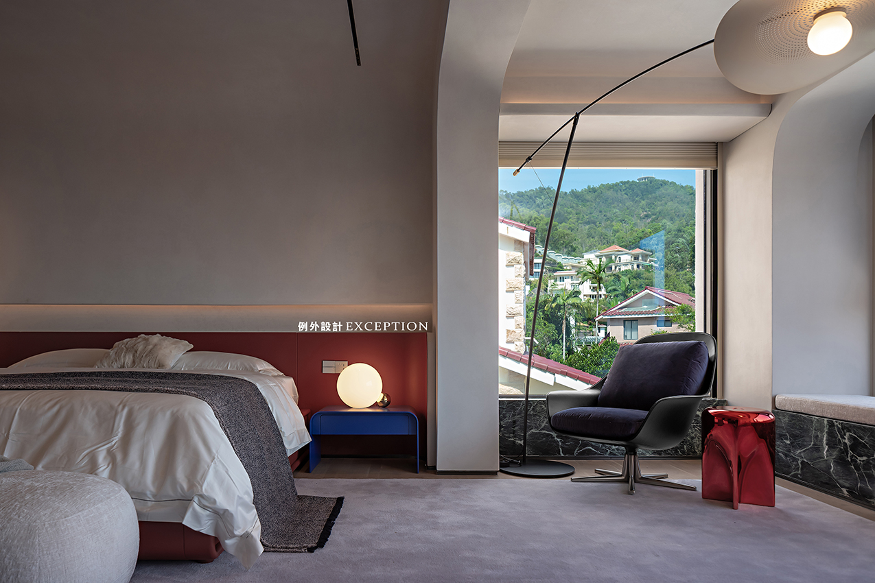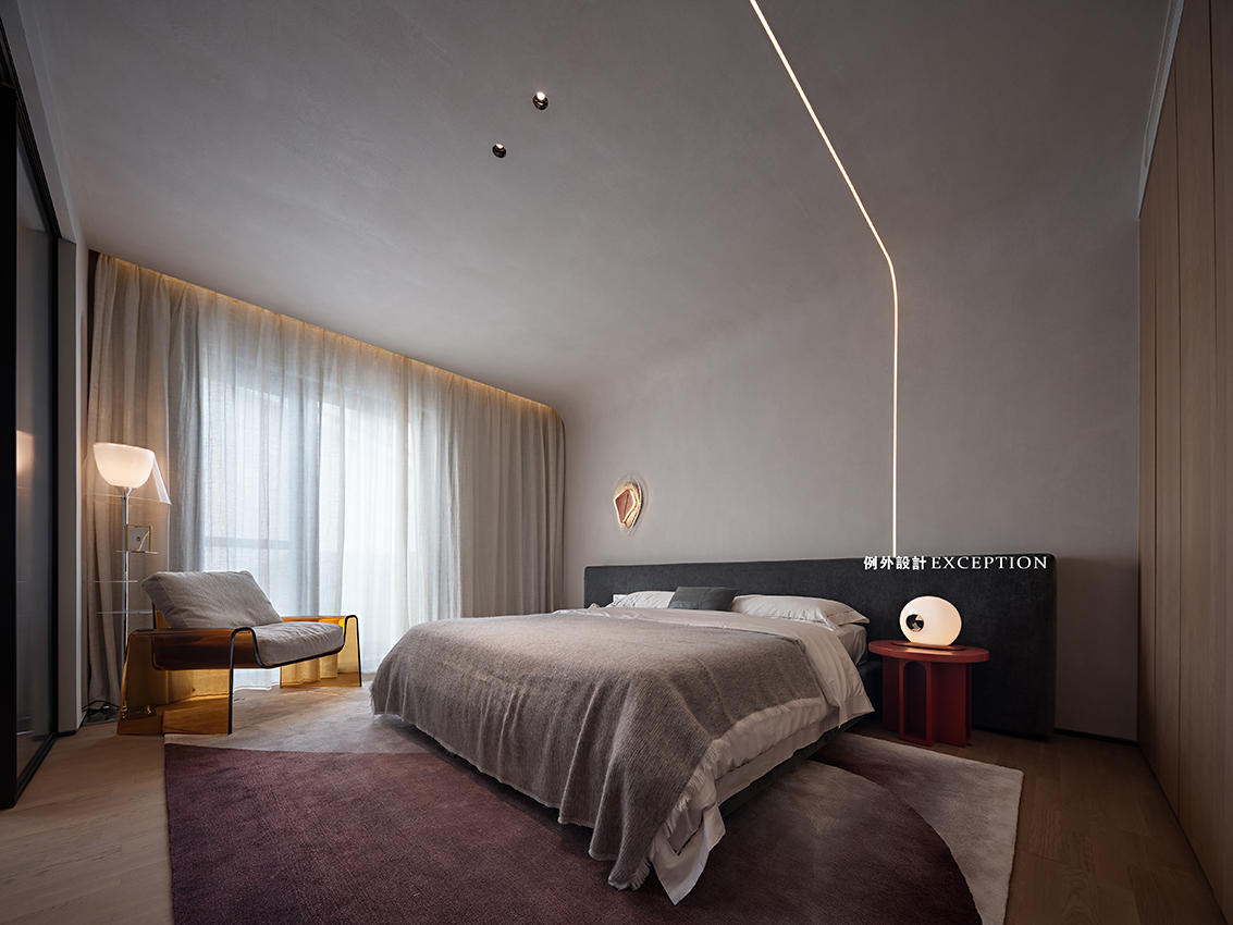 三樓主要是屋主夫妻倆的空間,包括主臥、主衛(wèi)、書房和衣帽間。主臥尺度非常舒適,睡眠區(qū)之外還做了休閑區(qū),既有單椅閱讀區(qū),也有美人榻,還有超長飄窗臺,互動的場景可以豐富多樣。睡眠區(qū)墻面的抽象畫來自藝術(shù)家馬樹青,它可以是月亮,也可以是純粹的白色,給人無限遐想。